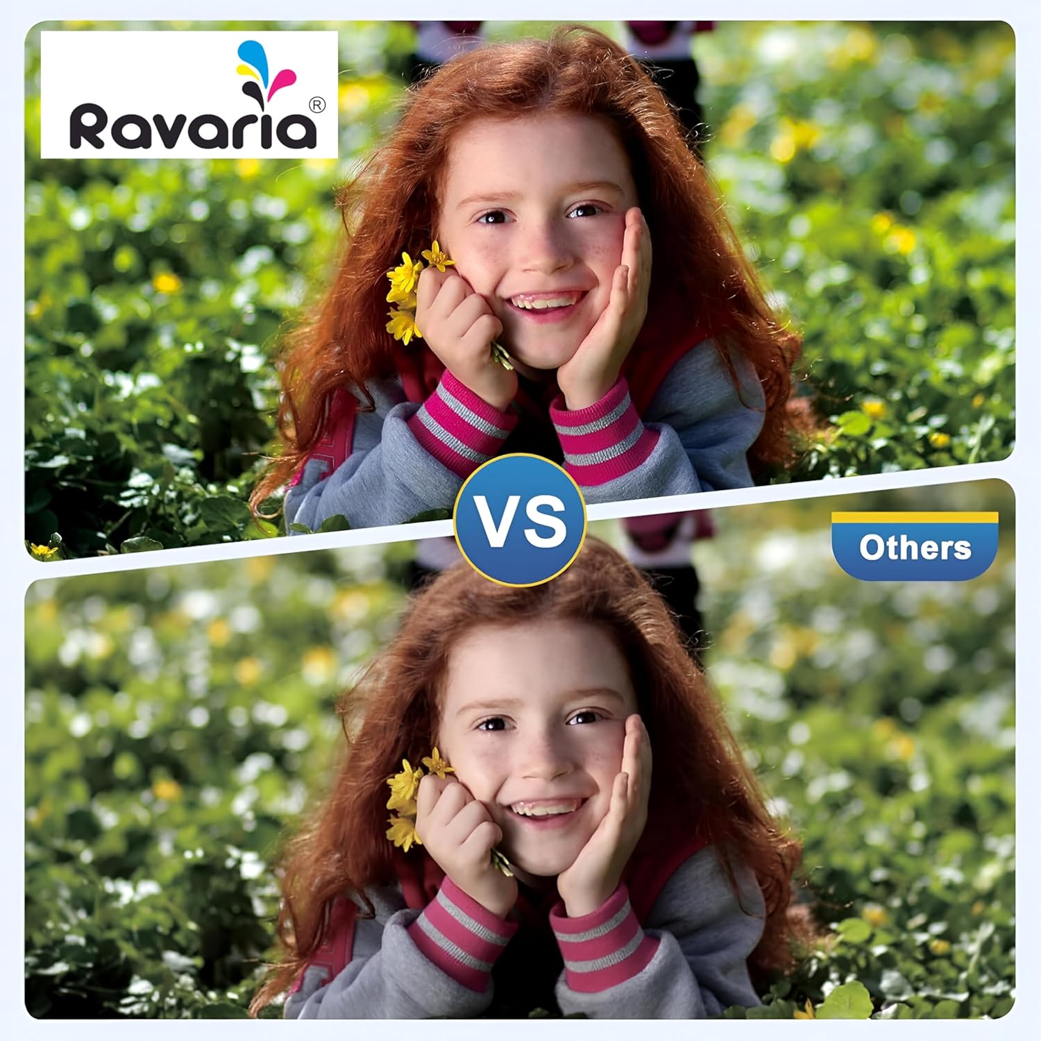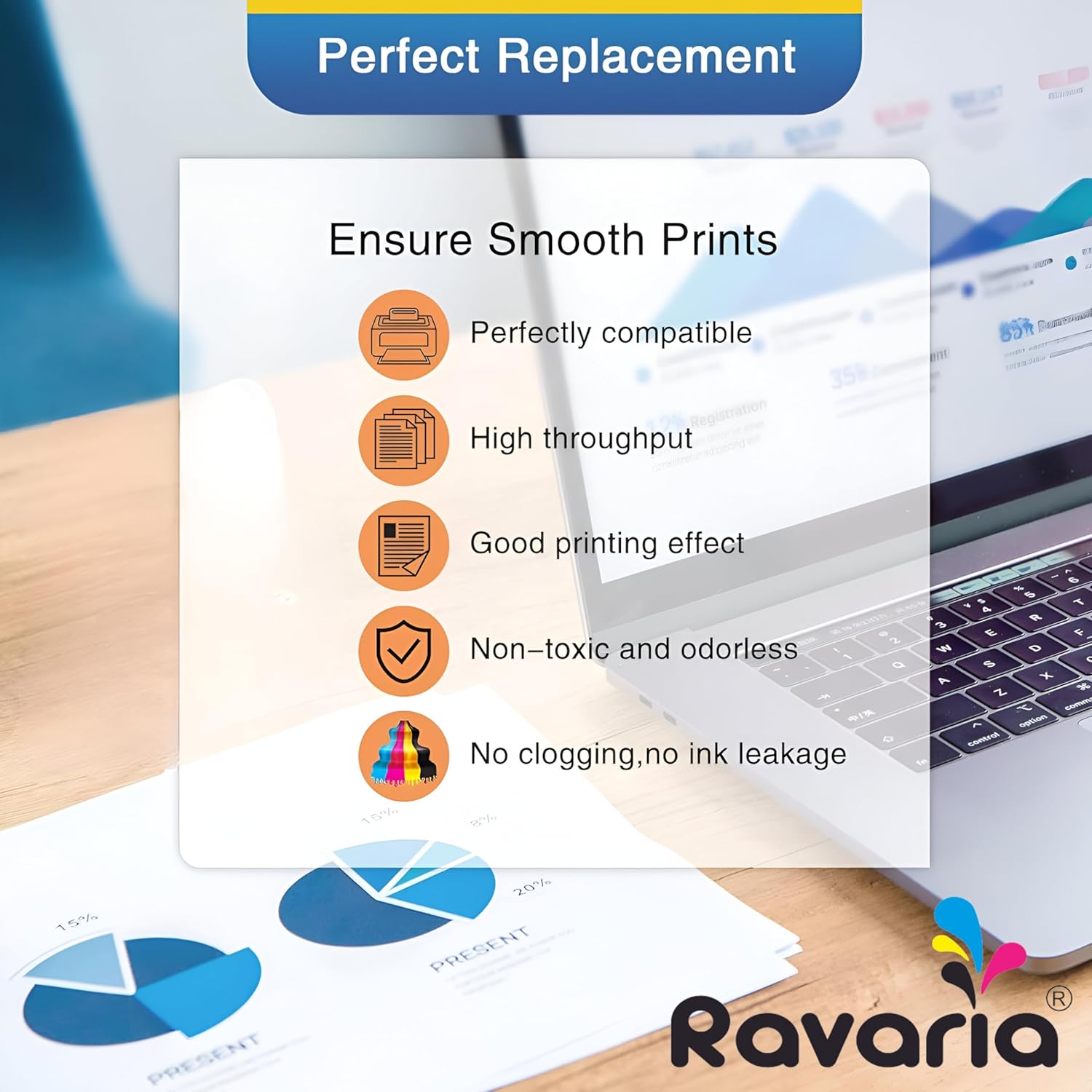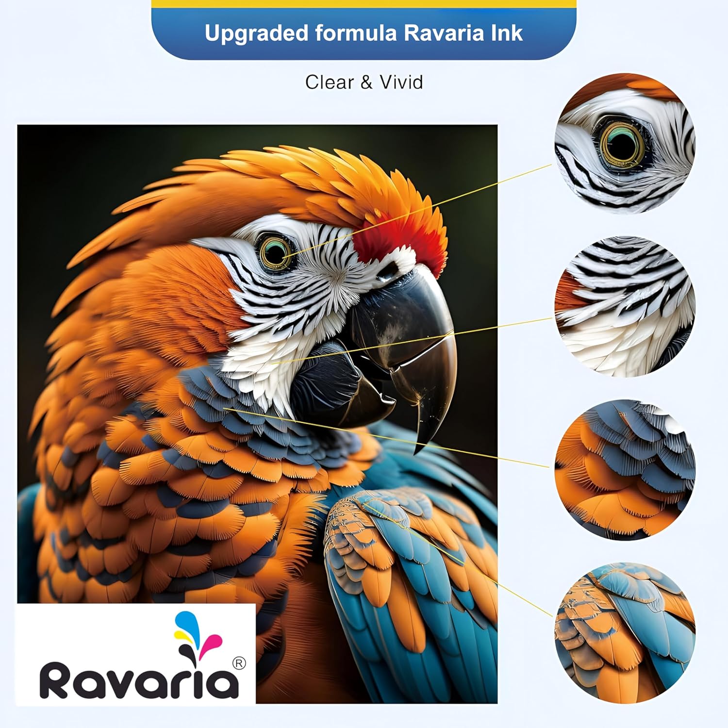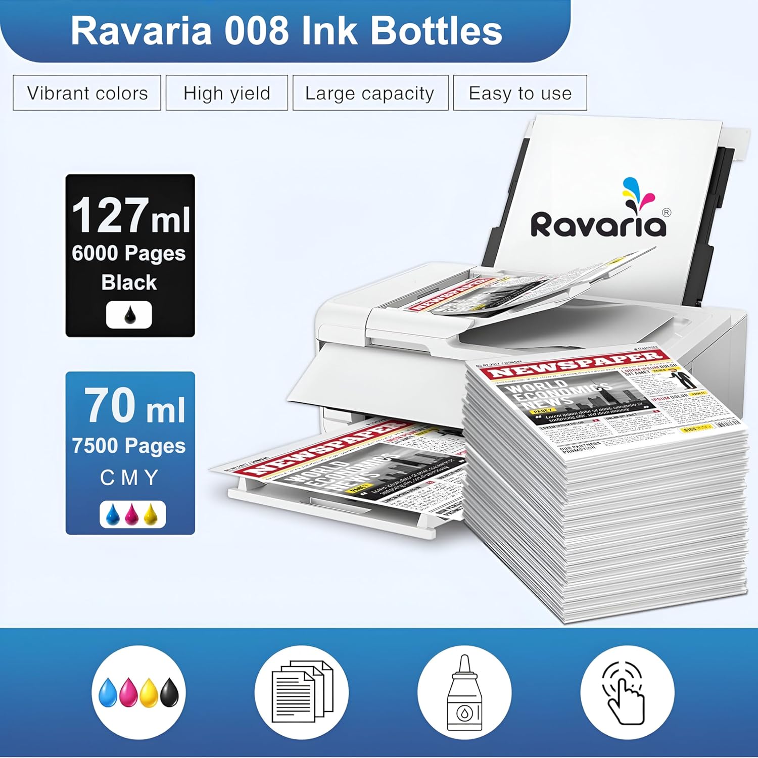 Introducing Ravaria Brand Ink, offering high-yield refills for black (127ML, 6000 pages) and color (70ML, 7500 pages). Enjoy easy refilling for prolonged printing efficiency.