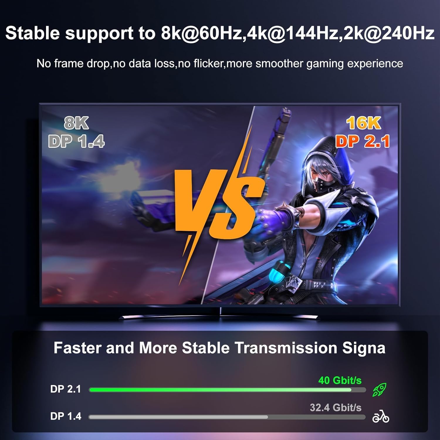 Ultra High-Speed Data Transfer: This 16K DisplayPort Cable supports resolutions up to 16K@60Hz, 8K@60Hz, and 4K@144Hz, with an incredible bandwidth of 32.4Gbps.
