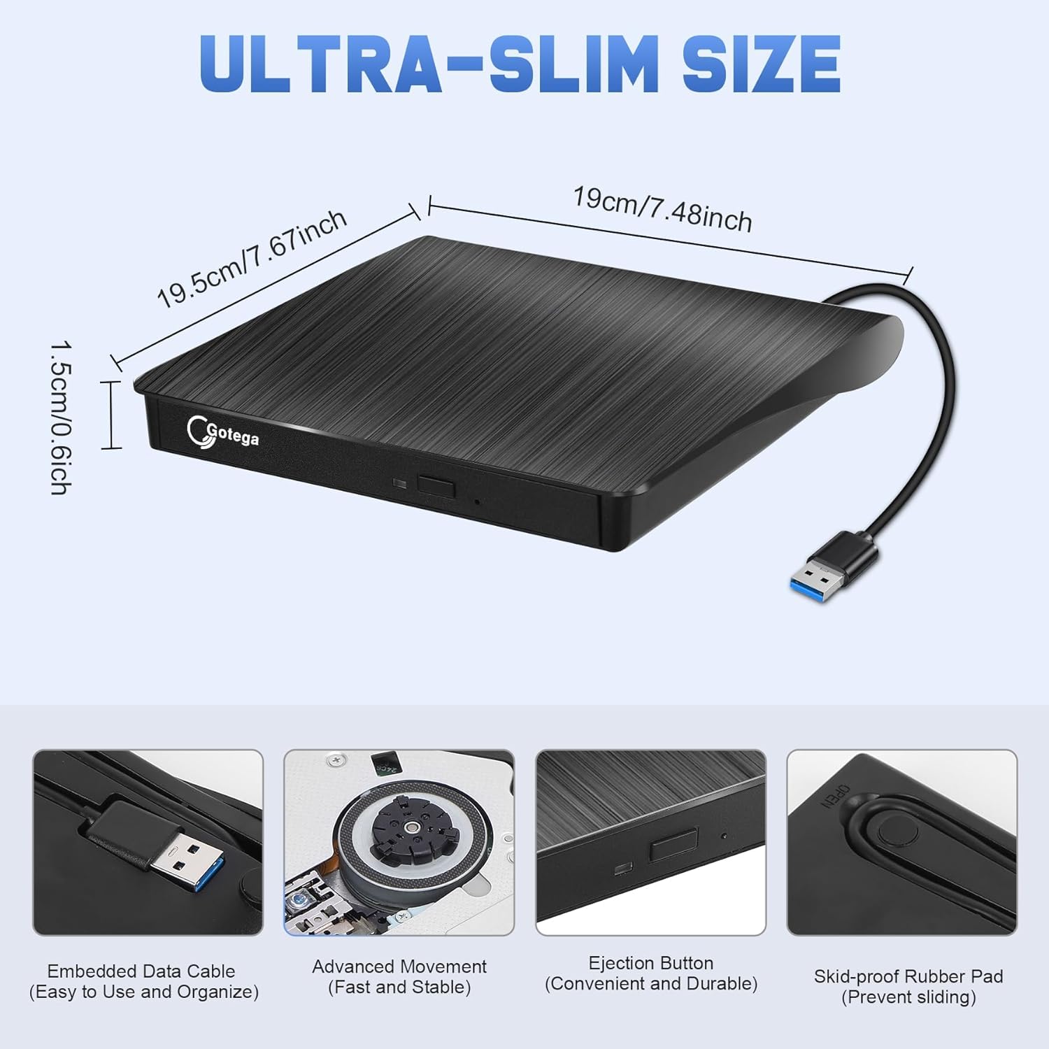 【Portable External DVD Drive】:WeFly Portable Slim External CD Drive is Thin & Compact. Embedded cable design with a slim lightweight body, this cd external drive can be slipped into your travel bag, and hooked up at any time, the best companion for computers without an internal drive.