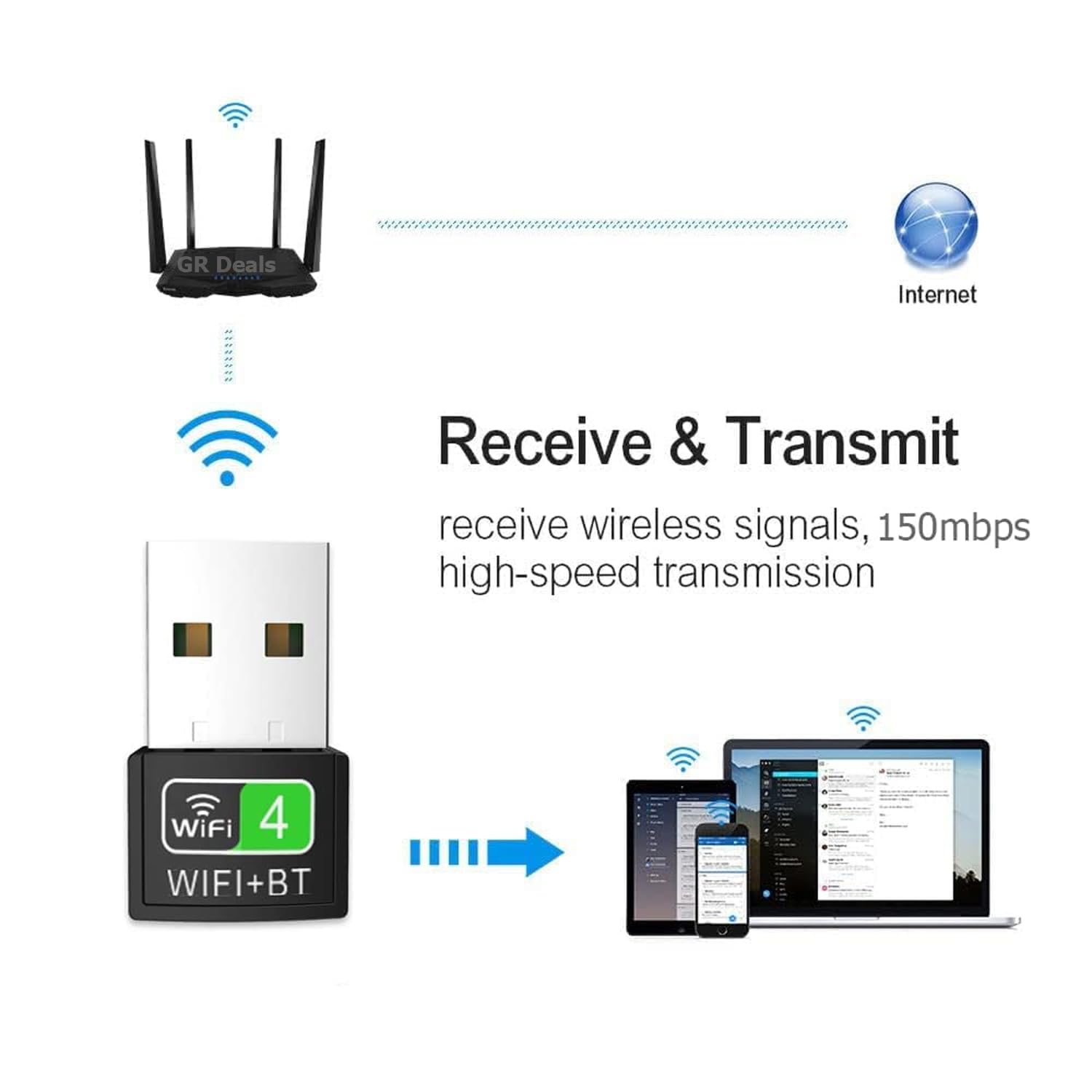 GR Deals WiFi Dongle Specifications – USB WiFi Bluetooth Adapter + Bluetooth 4.0 wifi Adapter transmission rate up to 150Mbps and WiFi dongle supports 2.4GHz band & 802.11b/g/n WiFi technology, ideal for gaming online and seamless HD video streaming and more.