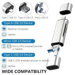 WIDE COMPATIBILITY — Standard USB plug (type A), Micro USB plug (type B) and USB C plug (Type C) combination, making this card reader compatible with all tablets and Android/ USB C smartphones that support OTG function