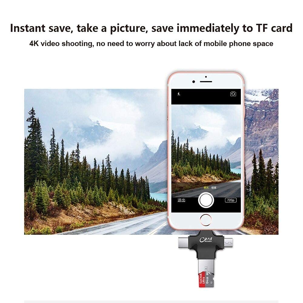 Fast Transfer Speed : The 4-in-1 OTG card reader is carved with latest technology and innovation. It has a reading speed of 20 -27 MB/sec and an equally fast writing speed of 11-20 MB/Sec. It can support 8G~256G (SD and TF card Memory cards of 64 GB and more must be of FAT32 format to be compatible with Android phones)