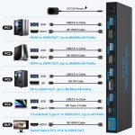 【KVM Switch 4 Computers 1 Monitor】This 4-port KVM switch with HDMI 2.1×2, DP 1.4 and USB C multiport allows 4 computers to share a single monitor and 4 USB 3.0 devices such as keyboards, mouse and printers, etc. This makes your workflow more efficient eliminating the need to change monitors and input devices frequently. Note: Each computer needs to be connected to the KVM with a USB 3.0 cable to recognize the four USB 3.0 ports on the front panel in order to properly recognize USB peripherals.