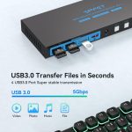 【4 USB3.0 KVM Switch】KVM Switch with 4 USB 3.0 ports supports 4 PC to share USB devices, such as keyboard, mouse, USB flash disk, printers, etc. And is backward compatible with USB 2.0 devices. USB 3.0 delivers data transfer speeds of up to 5Gbps, which is up to 10 times faster than USB 2.0’s 480Mbps. It can transfer files and pictures at a faster speed, making work and life easier and more convenient. In addition, In addition, the KVM Switch features hot-swapping to protect devices from damage.
