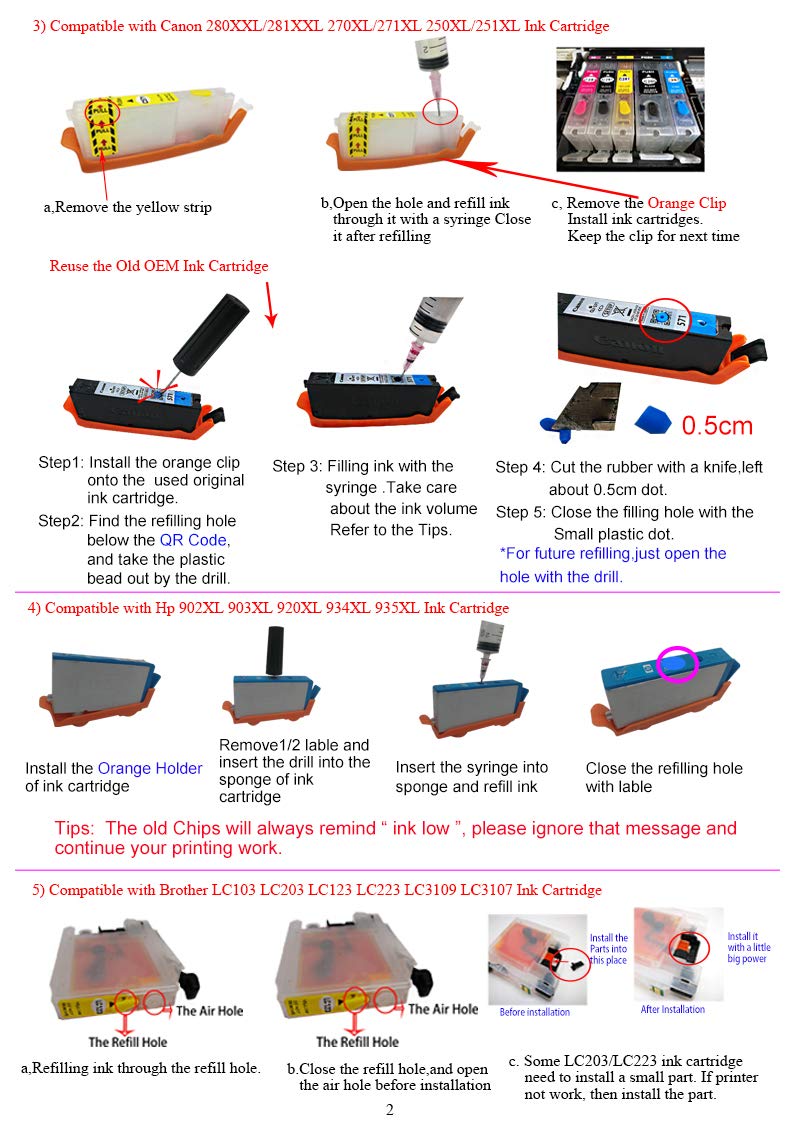 5) Can be Filled with Dye Ink many many times . 1 set Refillable Ink Cartridge = N sets compatible ink cartridge , 90% cost saving , Reduce 90% pollution,protect the earth together.