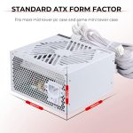 150*140*86mm. Standard atx form factor.White power supply is very suitable for pairing with your white computer case or sea view room pc case.