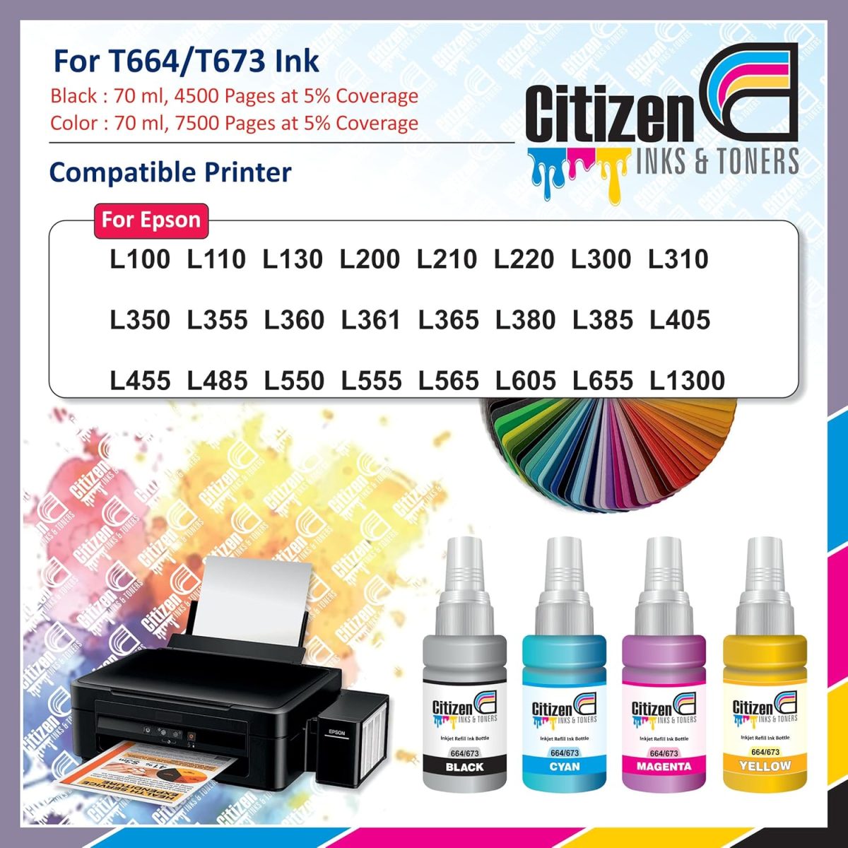 Printer Compatibility: Tailored for Epson L130, L360, L380, L361, L565, L210, L220, L310, L350, L355, L365, L385, L405, L455 and L485 this ink is specifically designed to work seamlessly with OEM printers using the 664 Ink Code.