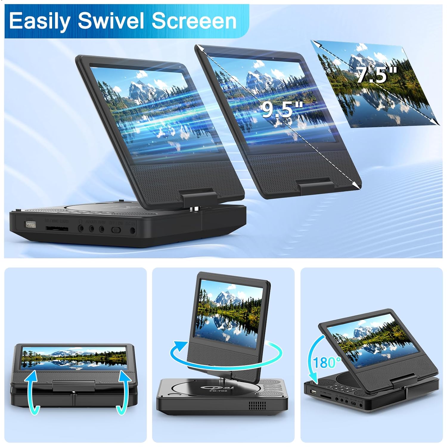 【Excellent visual experience】7.5-inch PJGCWB portable DVD player has a 270° rotating and 180° flipping eye protection screen, the resolution can reach 800*480, the body is compact and easy to carry, it is very suitable to put on the car seat, giving you an excellent visual experience.