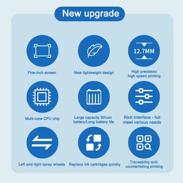 1【Smart Chip, Stable Operation】The A.C.I. inkjet printer is equipped with upgraded 4-core CPU chip, which makes it run more smoothly. Compared with other inkjet printers, it has the functions of one key to enlarge / reduce patterns, import fonts, import documents and rotate fonts, which makes your operation more smooth and improves the practicability of the product.-4.3Inch LED Color Touch Screen: The upgraded inkjet printer is equipped with Our handheld inkjet printer has clear screen colors 2- Multi-Material Printing: The handheld printer uses professional ink cartridges, high-definition quick-drying ink cartridges (black) are specially designed for industrial printing applications, which is quick-drying, smooth printing, clear images, and strong adhesion. It can print different characters on a variety of materials, such as carton, stone, wood, pipe, metal, glass, plastic, clothes, etc. The handheld inkjet printer is very suitable for manufacturing, warehouse, logistics. 3 -Professional Printing Function: This handheld printer supports editing and modifying content to directly print text, graphics, bar codes, symbols, trademarks, logos, QR codes, bar codes, time, date, etc. It supports the use of U disk to import and print special documents such as files (csv, .txt) and pictures (bmp). You can install it on the bracket, which can achieve assembly line inkjet printing. 4-Humanity interface: 4.3 inch Colorful touch screen, Shoot to your industry environment and working way, operate fluently, quick response. . Easy to edit: all kinds of parameters adjustment, what you edit is what you get. . Full equipped text types: Build in common use text types, hollow, dot matrix, Outer text input etc, suit to the demands of all industries. . Support 20 languages and inputs: Switch with only one press, easy to operate. 5- Adjustable Precision Printing: Hand-held inkjet printers have two optional printing precisions of 300DPI and HD 600DPI, and the 600DPI high-definition print head can be adjusted up and down. Printing height: minimum 0.08 inches (2 mm), maximum 0.5 inches (12.7 mm). The best printing distance is 2-5mm. Supports 20 languages (Chinese, English, Japanese, Korean, Spanish, Portuguese, etc.), which is very convenient to operate.