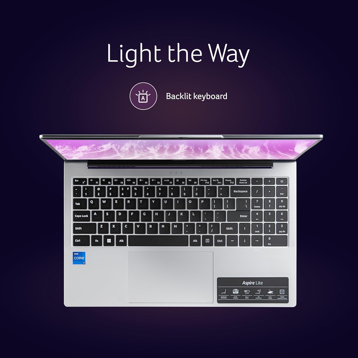 Acer Aspire Lite, Intel Core i7 12th Gen – 12650H, 16 GB RAM, 512 GB SSD, Full HD IPS 15.6″/39.62 cm, Windows 11 Home, MS Office, Pure Silver, 1.70 KG, AL15-52H, Backlit Keyboard Laptop
