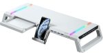 The multifunctional monitor stand features an integrated mobile phone and tablet holder, along with a storage compartment and RGB lighting, enhancing the organization and aesthetics of your desktop