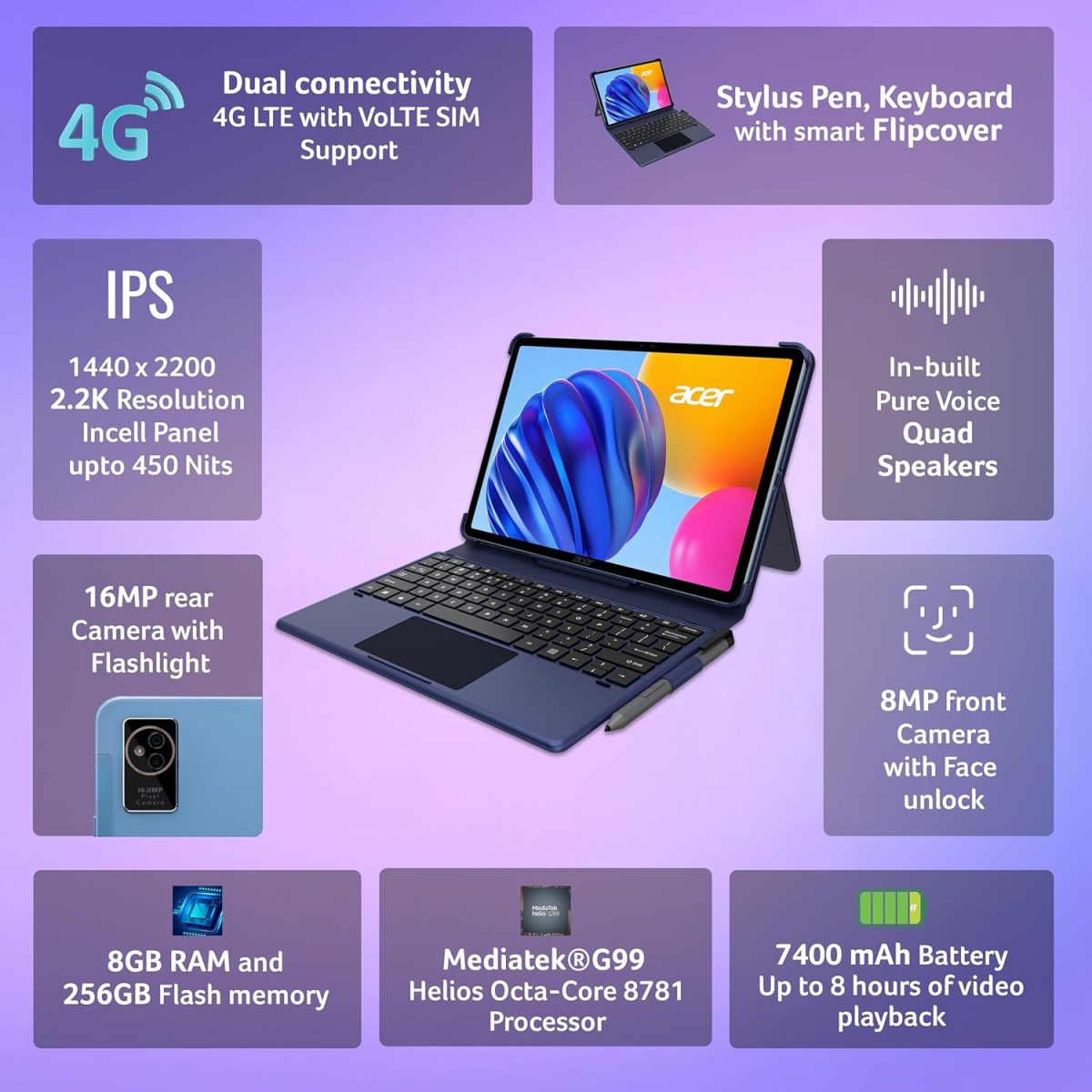 Acer Iconia Tab iM11-12M | 11.45” 60 Hz IPS Display, 450 nits, 8GB RAM + 256GB storage, 16MP Rear + 8MP Front Camera,Fingerprint Reader,Wi-Fi + 4G LTE(Calling), Android 14,BT 5.2, Slim Metal Body,Blue