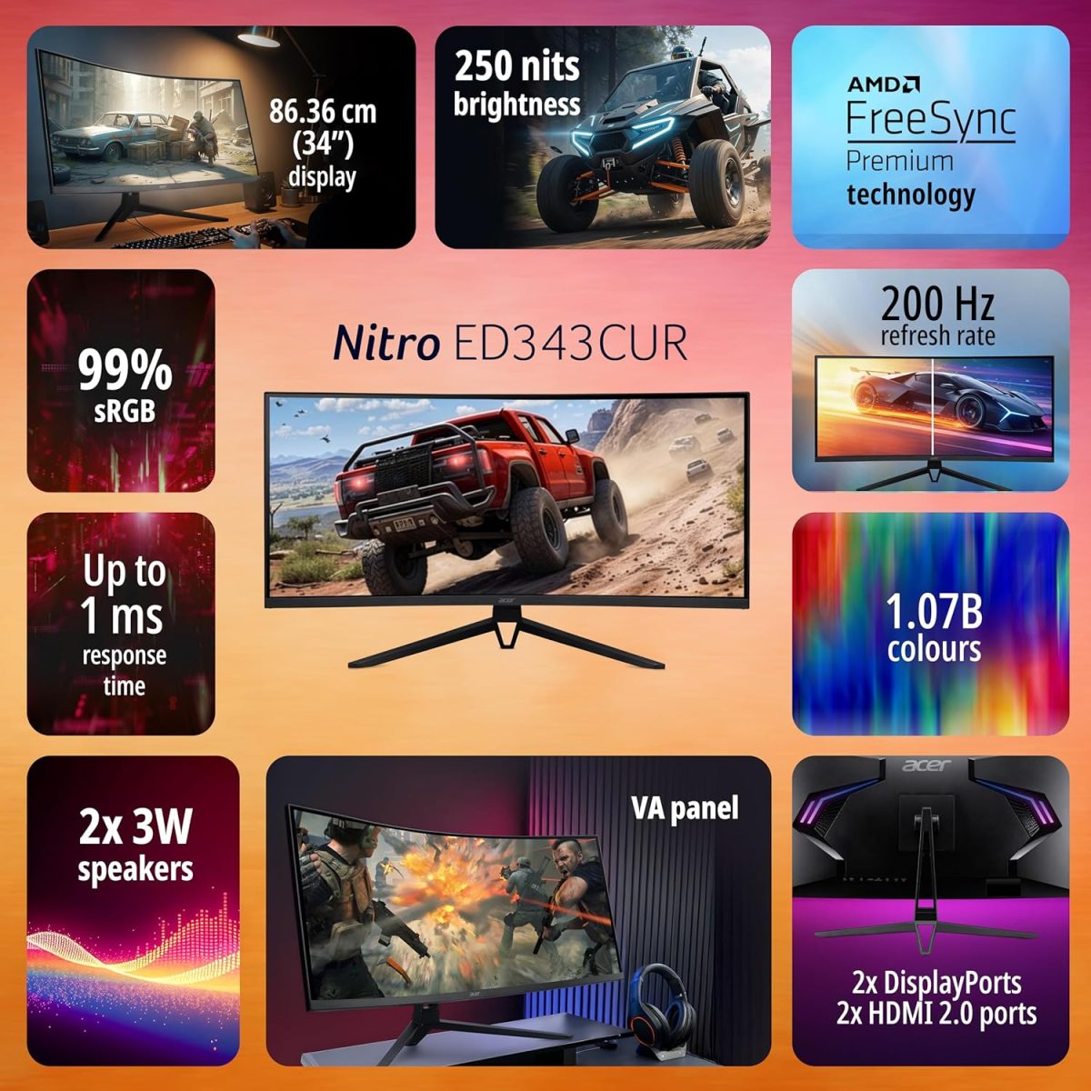 Acer Nitro ED343CUR X0 34 Inch UWQHD (3440×1440) 21:9 Curved Gaming Monitor | 200Hz Refresh, 0.5ms Response | AMD FreeSync Premium | HDR10 | RGB Lighting | 2×HDMI 2.0, 2×DP 1.4, Audio Out, Speakers
