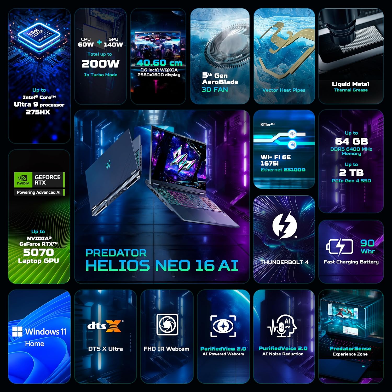 acer Predator Helios Neo 16 AI, Intel Core Ultra 9 Processor,RTX 5070-8 GB GDDR7,32 GB/2 TB, WQXGA IPS, 16.0″/40.64 cm, 240Hz, Win 11 Home, Abyssal Black, 2.7 kg, PHN16-73,RGB KB, Gaming Laptop