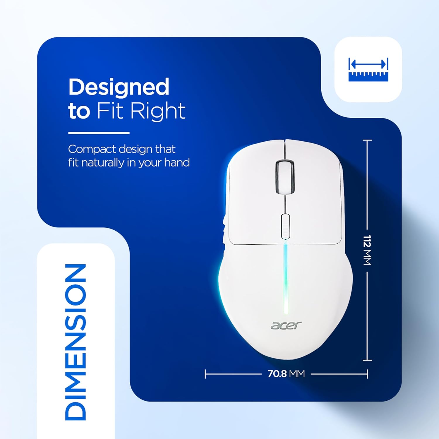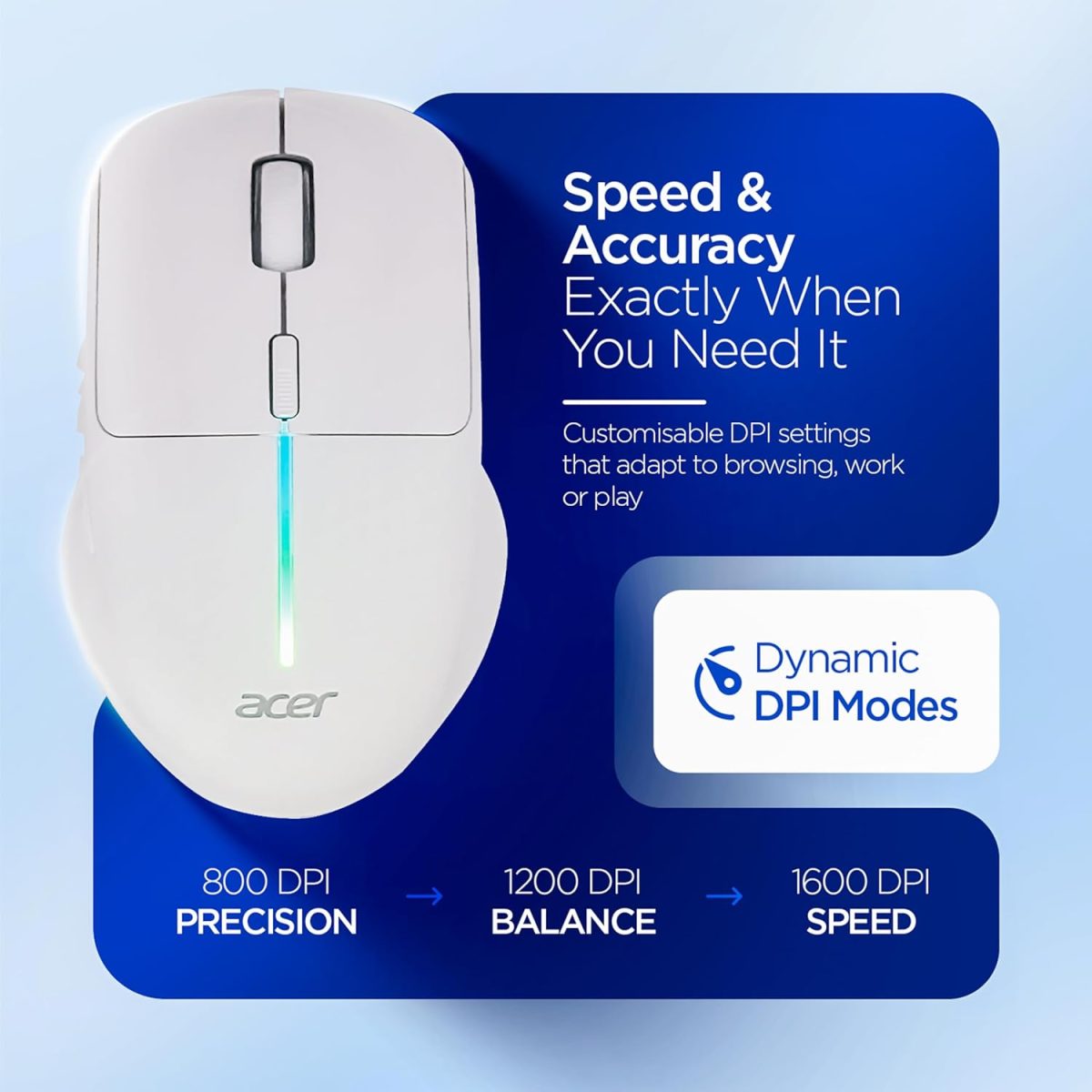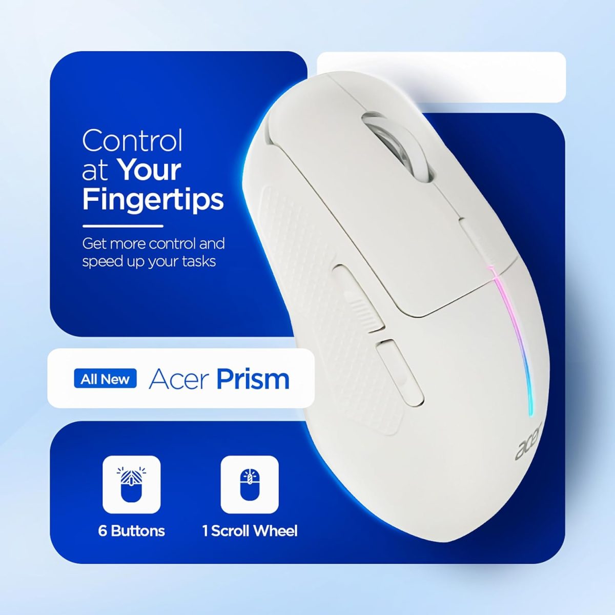 Acer Prism Wireless Mouse | Dual Mode 2.4GHz & BT 5.1 | 6 Buttons with Scroll Wheel | 800/1200/1600 DPI | Rechargeable 500mAh Battery | Running RGB | Lightweight 73g I Windows & Mac Compatible – White