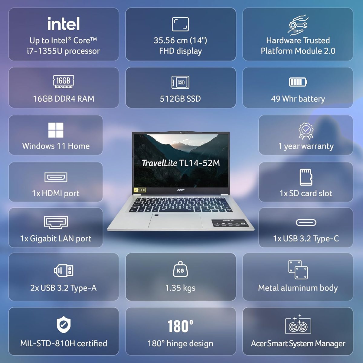 acer TravelLite Business Laptop, 13th Gen, Intel Core i7-1355U Processor (Windows 11 Home/16 GB RAM/512 GB SSD) TL14-52M with 35.5 cm (14″) Full HD IPS Display, 1.38 kg