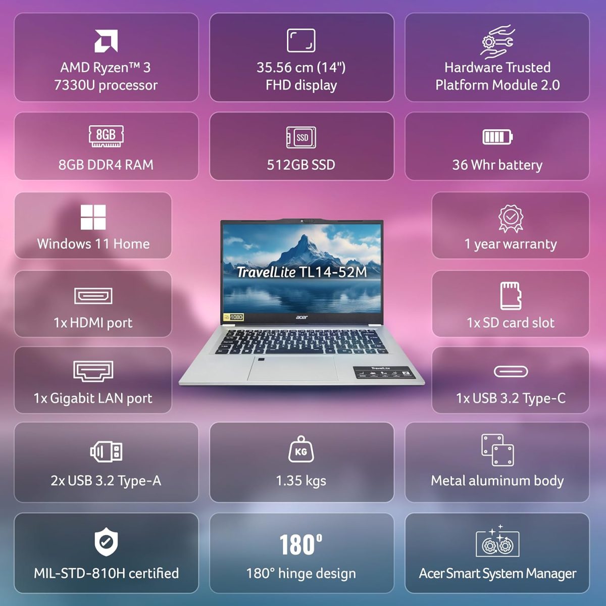 ACER TravelLite Business Laptop, AMD R3 7330U Processor (Windows 11 Home/8 GB RAM/512 GB SSD) TL14-42M with 35.5 cm (14″) Full HD Display, 1.34 kg