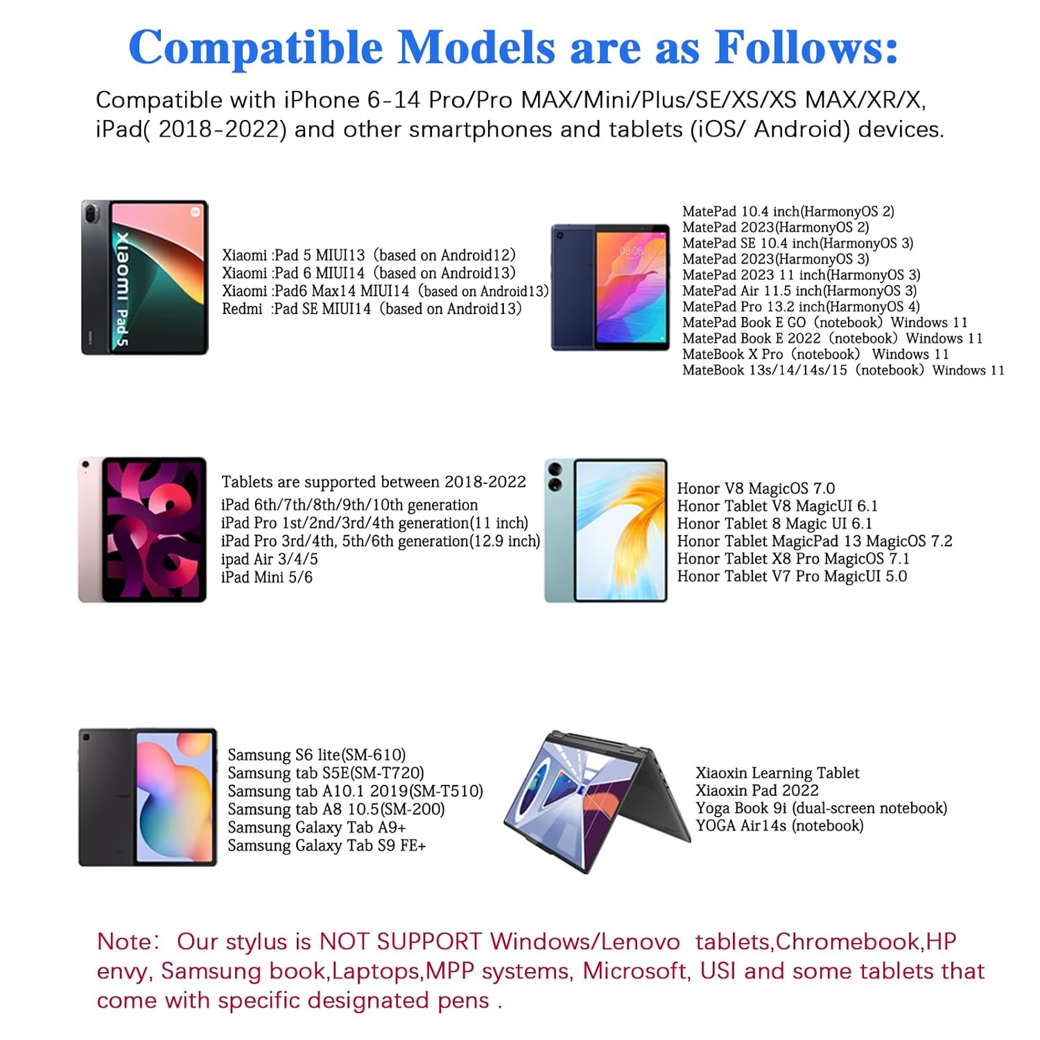 Widely Compatible Our Rechargeable Ipad Pro Pencil Are Specially Design For Most Touch Screen. It Is Compatiable With Most Touch Of Model Of Apple Ipad, Samsung Smartpad Series, Android Tablets, And Also For Iphone 6/6Plus, Iphone 7, 7Plus, Iphone 8, Iphonexr/ Xs, Ipad/Ipad 2, New Ipad 3/4, Ipad Pro, Ipad/Mini 2/3/4 And Other Most Popular Tablets, Smartphones. Note–You May Experience Response Delays And Incompatible Situations On Laptops With Windows System.