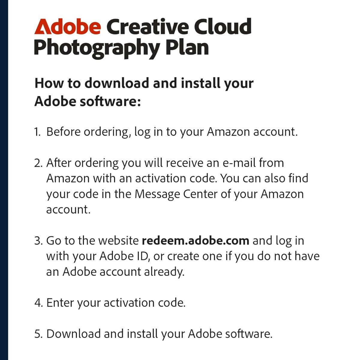 After your purchase, Amazon will send you a link and activation code. Sign on with your Adobe ID or create a new one. Enter the code and download all programs you plan to use.