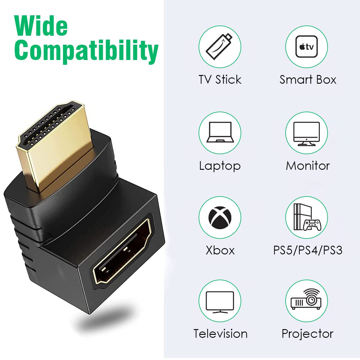 This 90 and 270 degree HDMI connector works for any devices that has HDMI port, also the best choice for connecting TV stick to TV.Compatible with all version HDMI cable