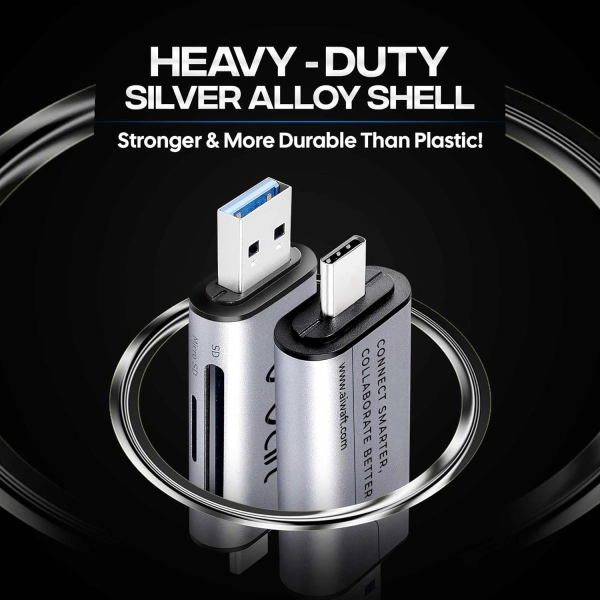 AIWaft 2-in-1 High-Speed Card Reader | USB 3.0 & Type-C | Premium Aluminum Body with Protective Case | Supports SD, SDHC, SDXC, MicroSD | Fast Data Transfer & OTG Compatible for All Devices