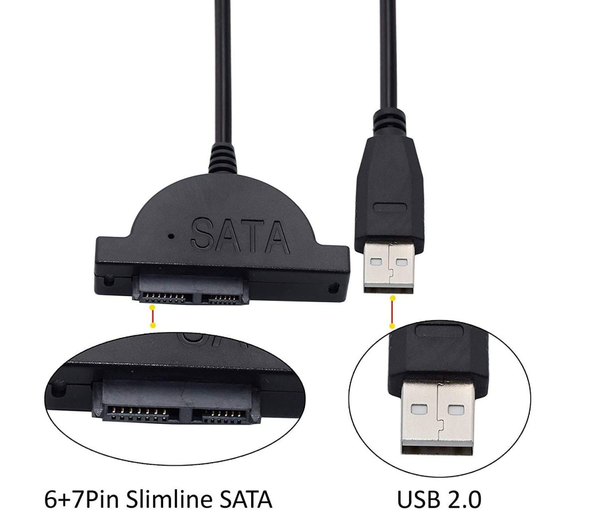 Connect 7+6pin Slimline SATA optical drive to computer via USB port for easy test and data transfer