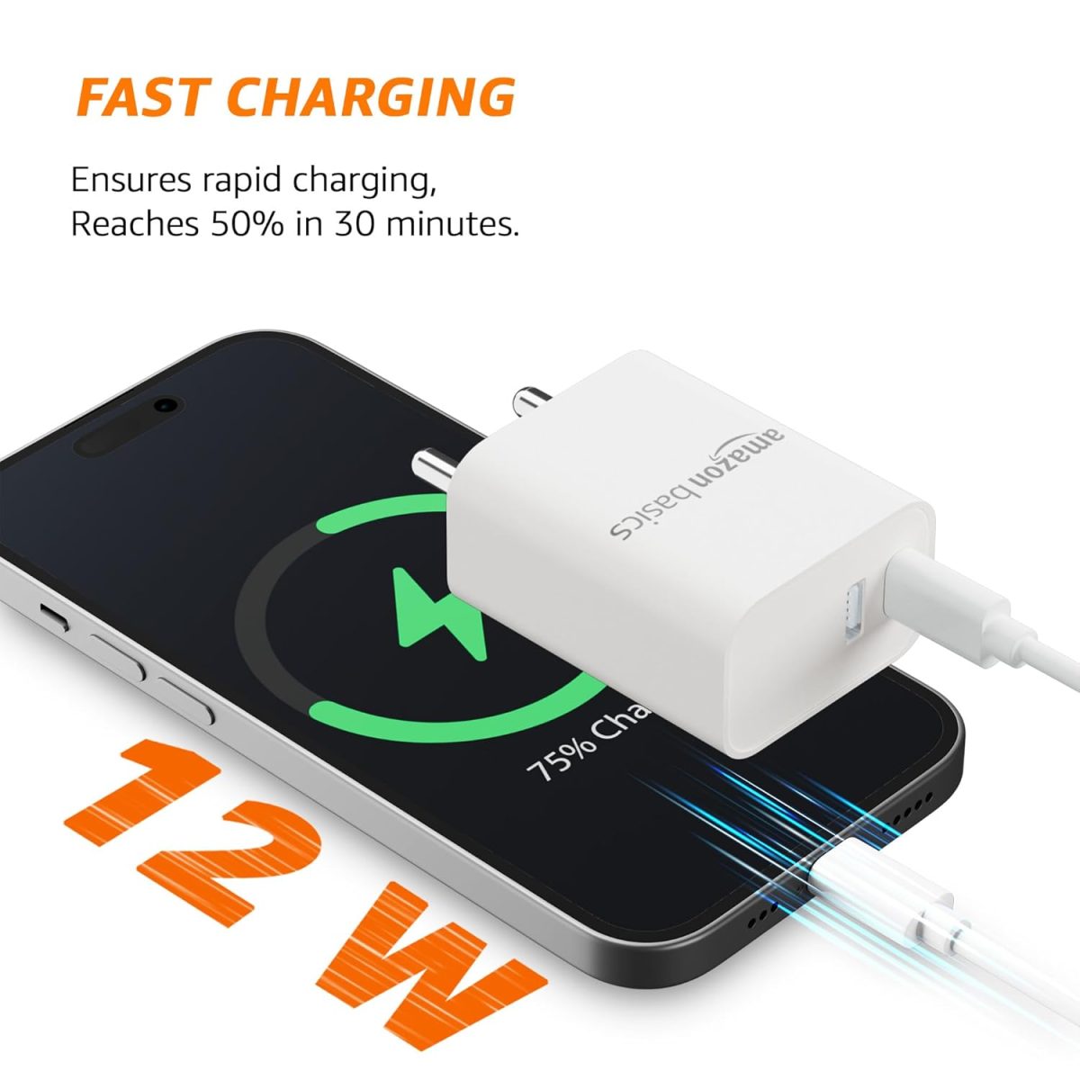 Amazon Basics 12W Dual Port Fast Charger | 12W Max Output | Includes 1 m Type C Cable | Universal Compatibility
