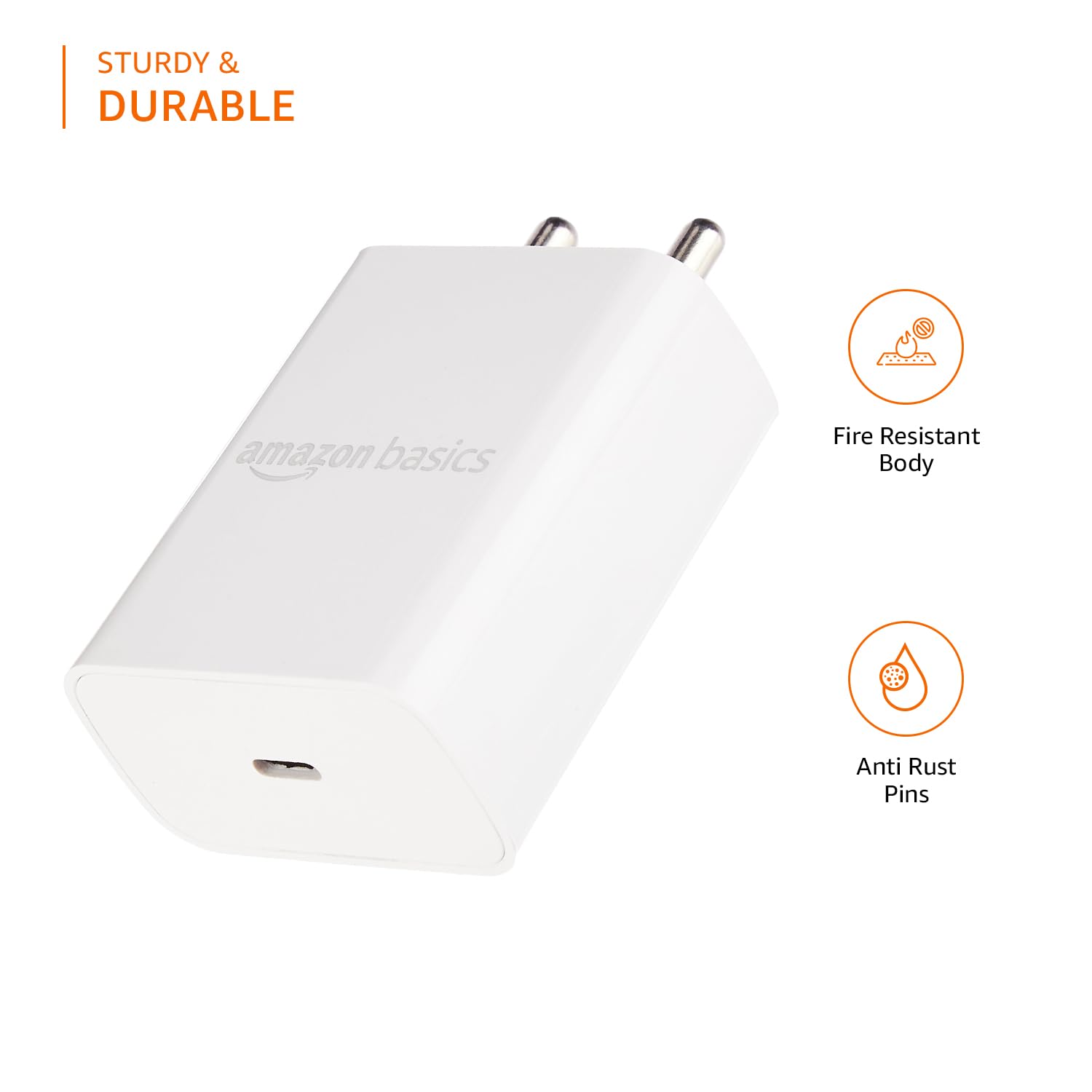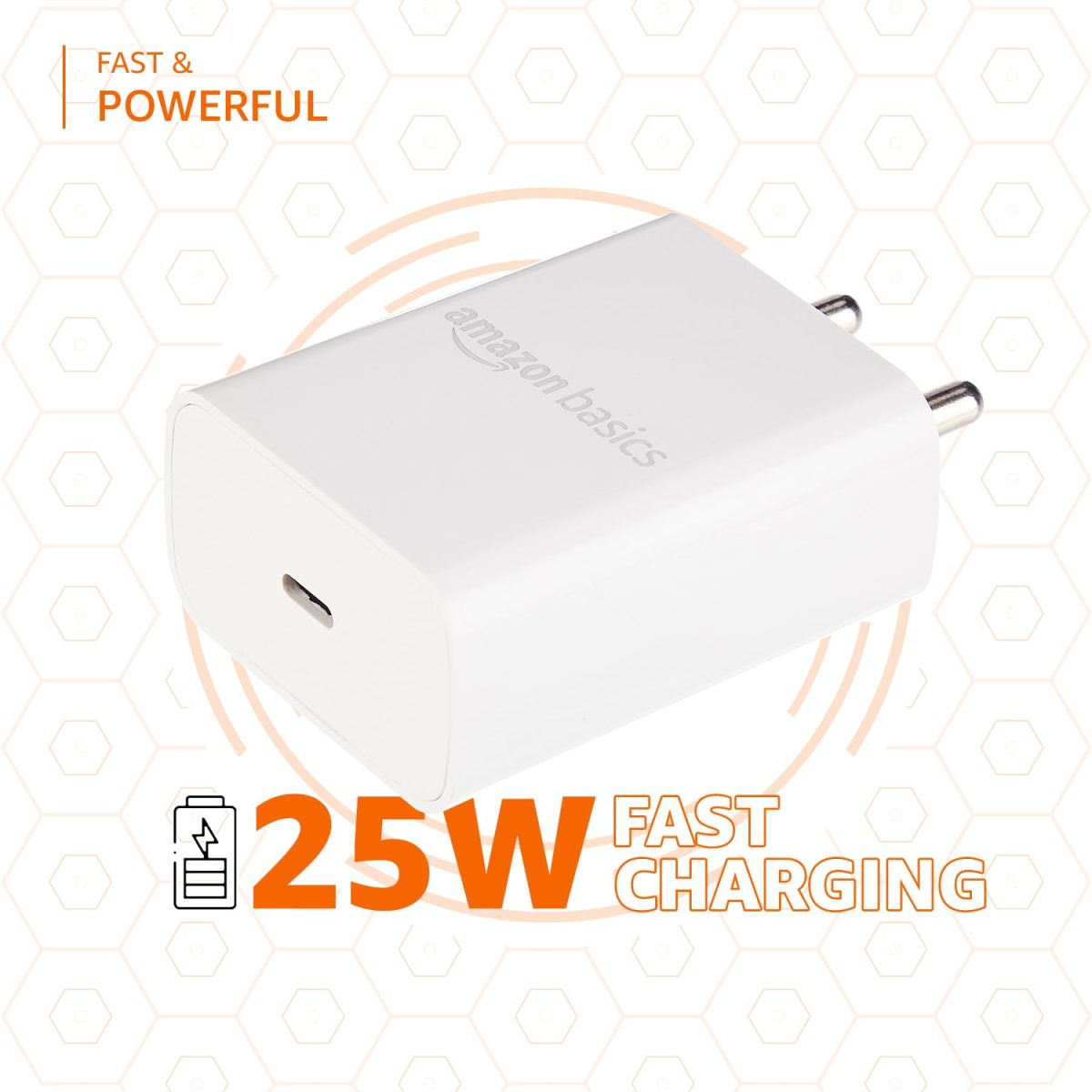 Amazon Basics 25W Compact Wall Charger | Type-C Fast Charging Adapter for Samsung, Xiaomi Phones and iPhone (White, Without Cable)