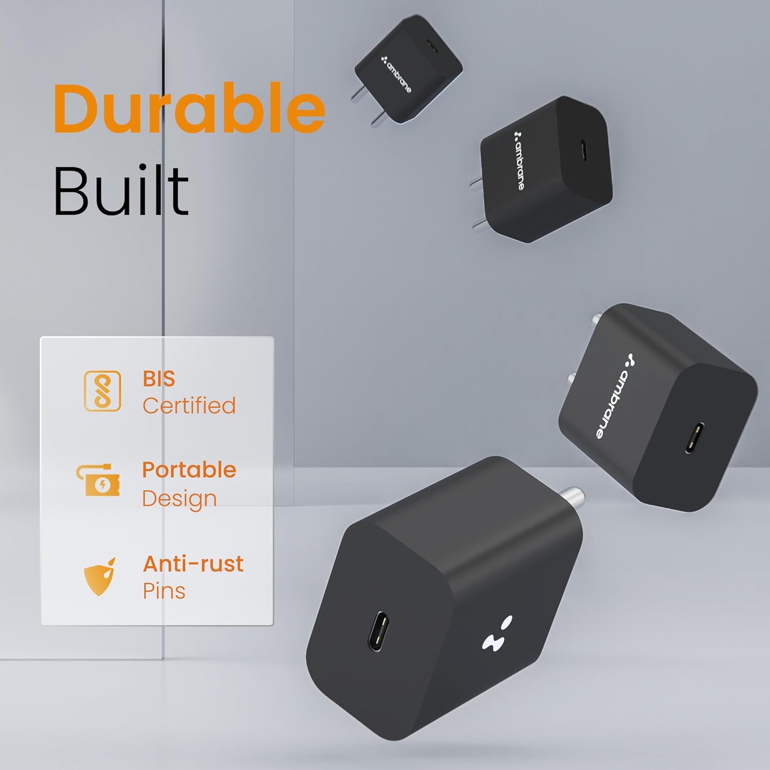 Ambrane 20W Type C Mobile Charger Adapter, Fast Charging for Android, iPhone 14/13,13/12/11/X & Pro, Max Series & Other Type C Enabled Devices, PD Technology, BIS Certified (Raap M20, Black)