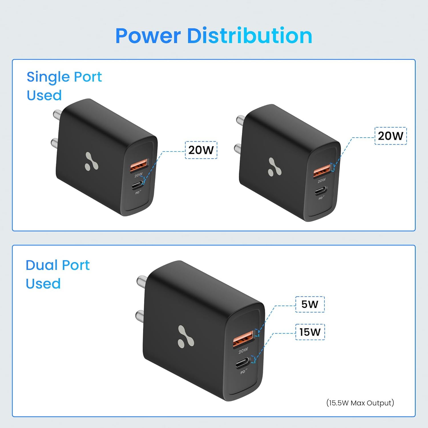 Ambrane 20W USB Dual Port BoostedSpeed Charger with Power Delivery & Quick Charge, Made in India, Multi-Layer Protection, iPhone & Android Compatibility (Raap H11, Black)