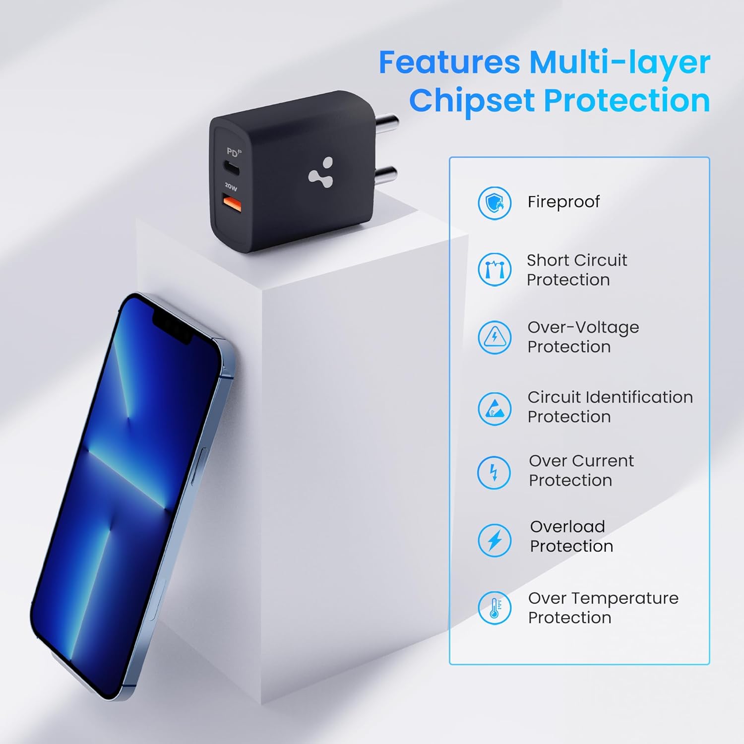20W Boosted Speed – Charge up your devices at a blazing speed with its 20W maximum output. QC-PD Fast Charging – This charger gives an ultra-fast charging experience with its Power Delivery (PD) and Quick Charge (QC) Technology. Dual Output – Enjoy wide compatibility as this charger comes with dual output for your USB and Type-C enabled devices. Multi-layer Chipset Protection – The charger comes with multi-layer chipset protection that gives protection against short circuits, over-voltage and more. BIS Certified – This product is BIS certified to provide you with a safe and reliable charging experience.