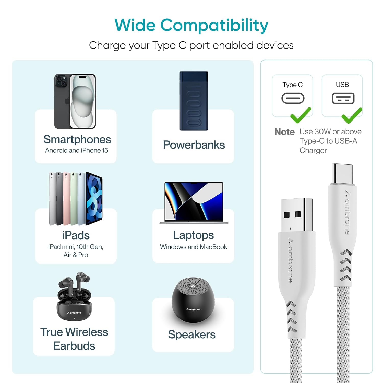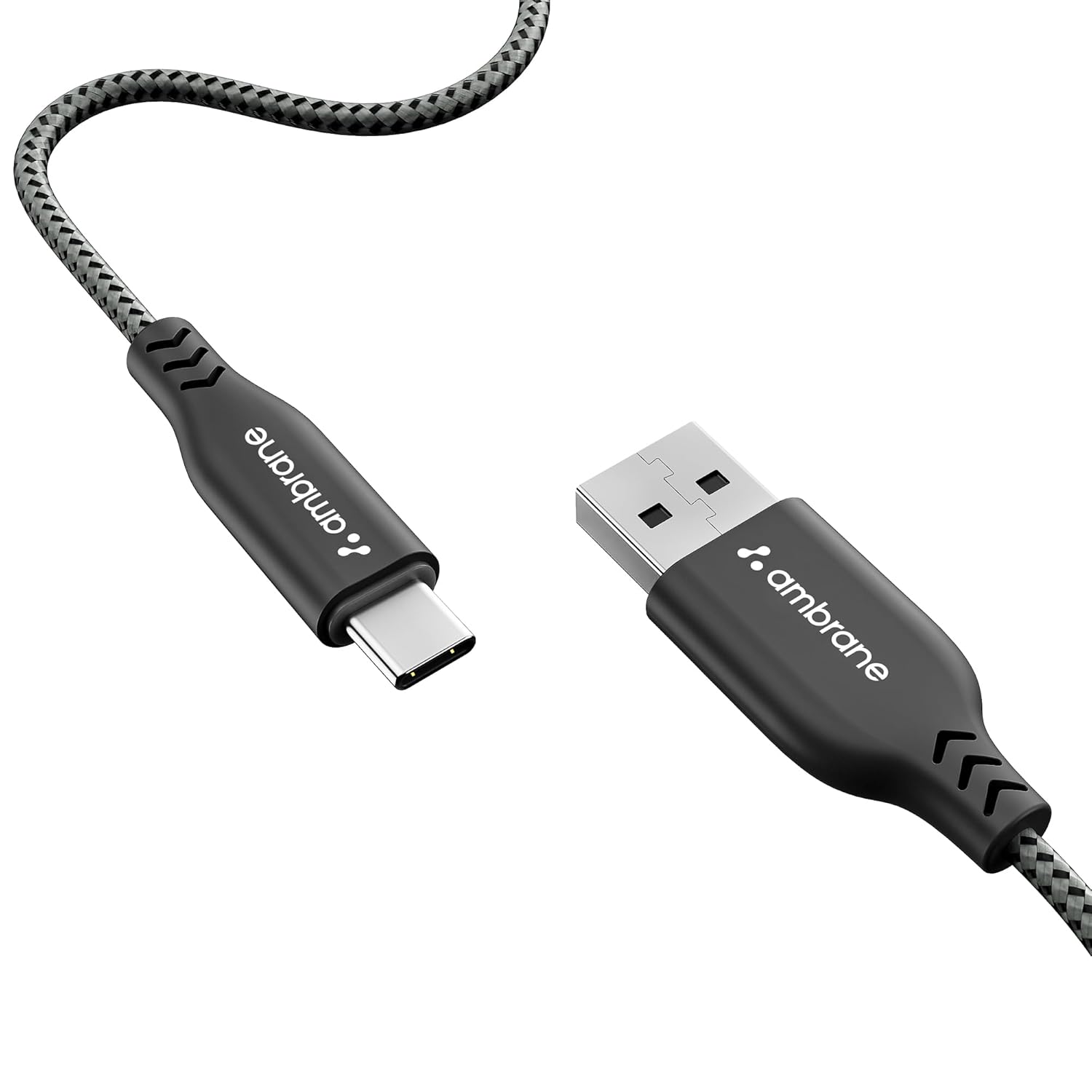 Ambrane Type C Cable 3A Fast Charging 1M Braided USB Cable For Smartphones, Tablets, Laptops & Other Type C Devices, 480Mbps Data Sync, Quick Charge 3.0 (RCT 10, Black)