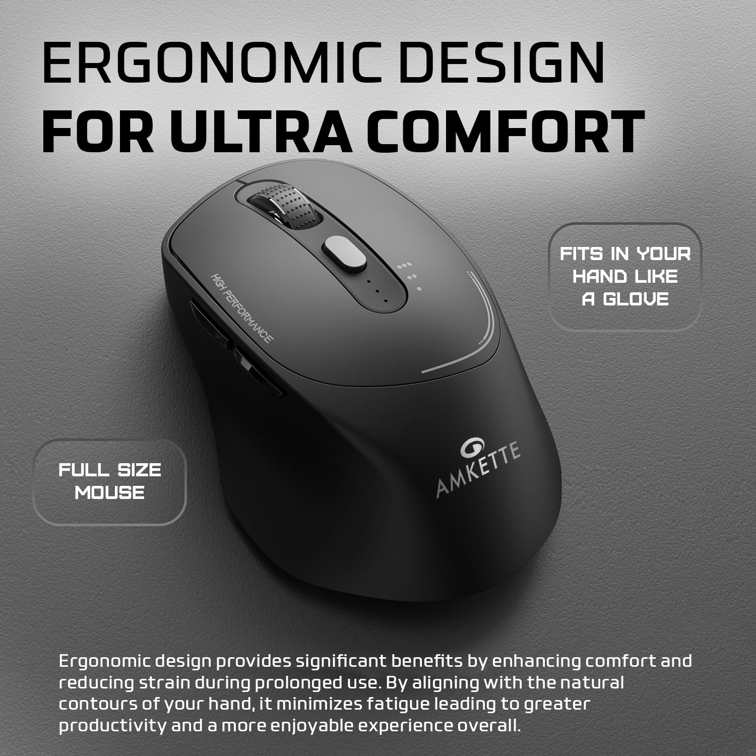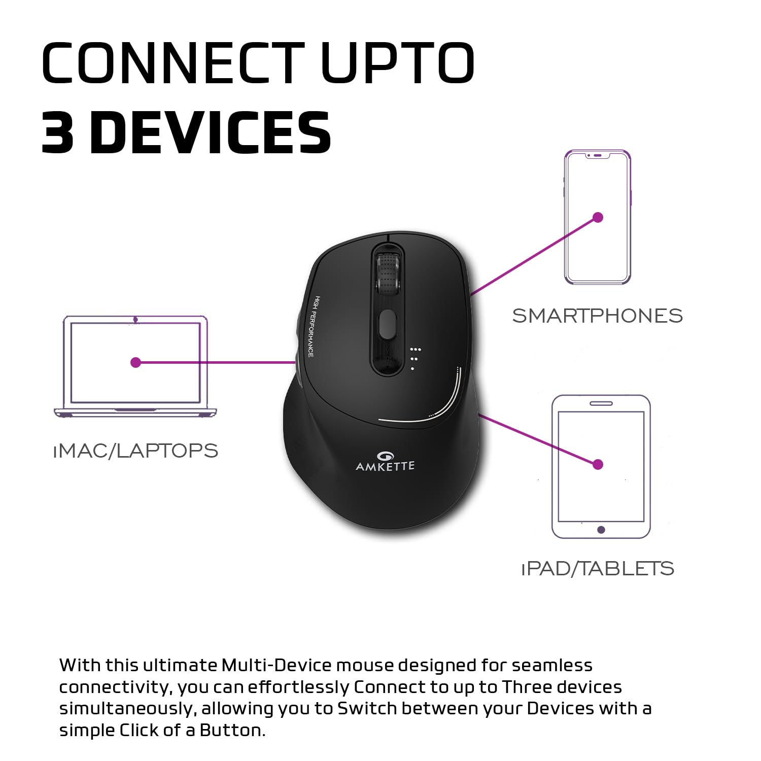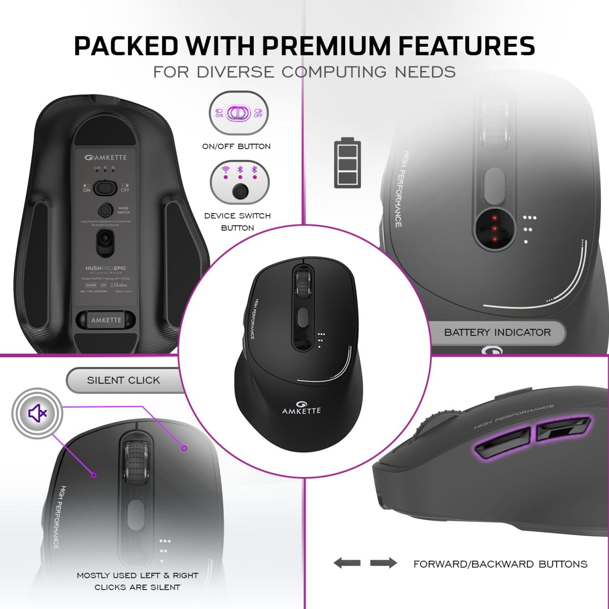 Amkette Hush Pro Epic Rechargeable Wireless Mouse/Bluetooth Mouse | 3 Device Connectivity with Bluetooth and USB 2.4 GHz | 2400 DPI | Silent Switches | Ergonomic Design | Type C Charging | Black