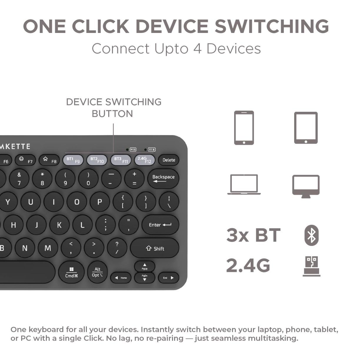 Amkette New and Improved Optimus BT 4 in 1 Multi Device Wireless Keyboard/Bluetooth Keyboard | One Click Device Switching and AI Access for Windows, MacOs, Android and iOS, Dual OS Layout (Grey)