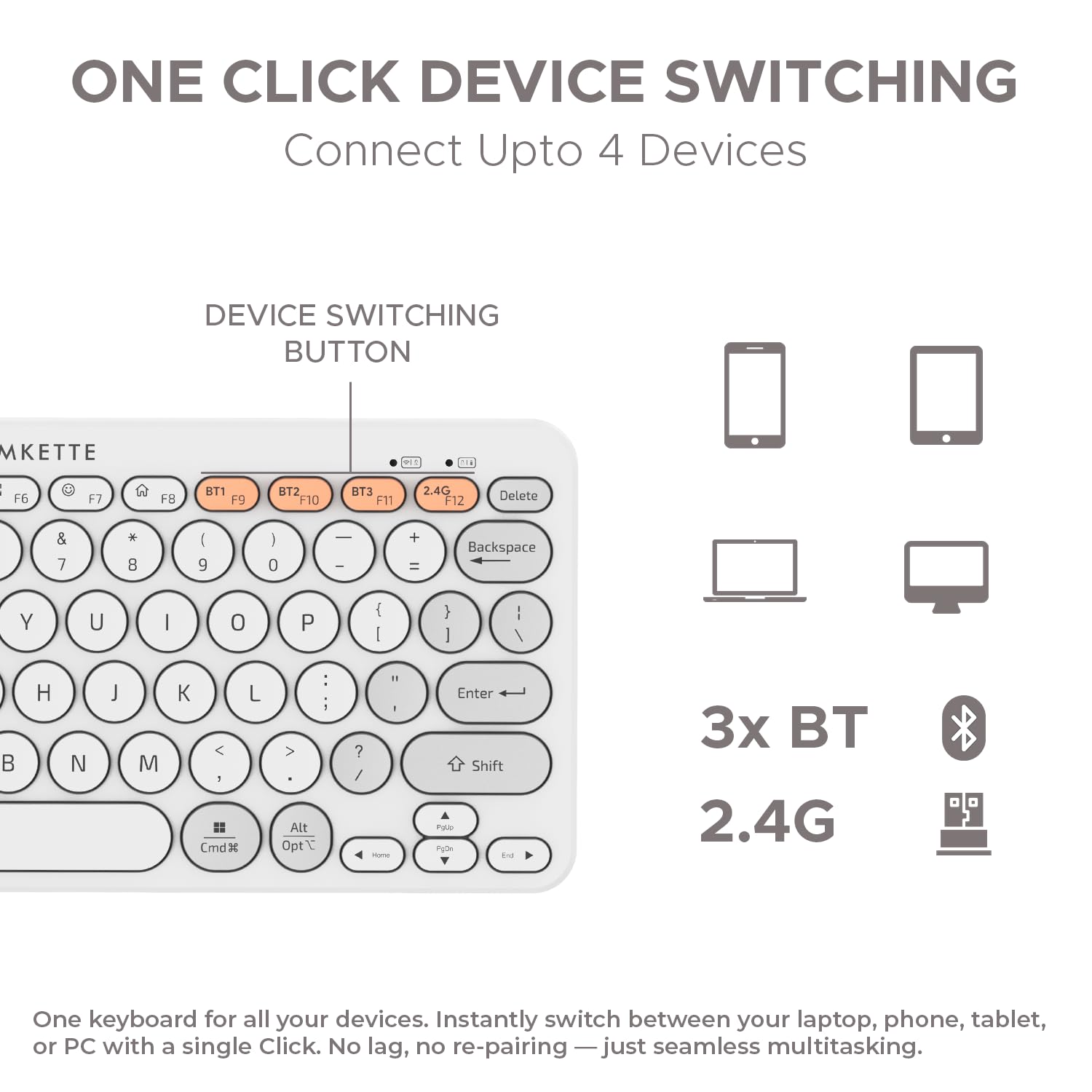 Amkette New and Improved Optimus BT 4 in 1 Multi Device Wireless Keyboard/Bluetooth Keyboard | One Click Device Switching and AI Access for Windows, MacOs, Android and iOS, Dual OS Layout (White)