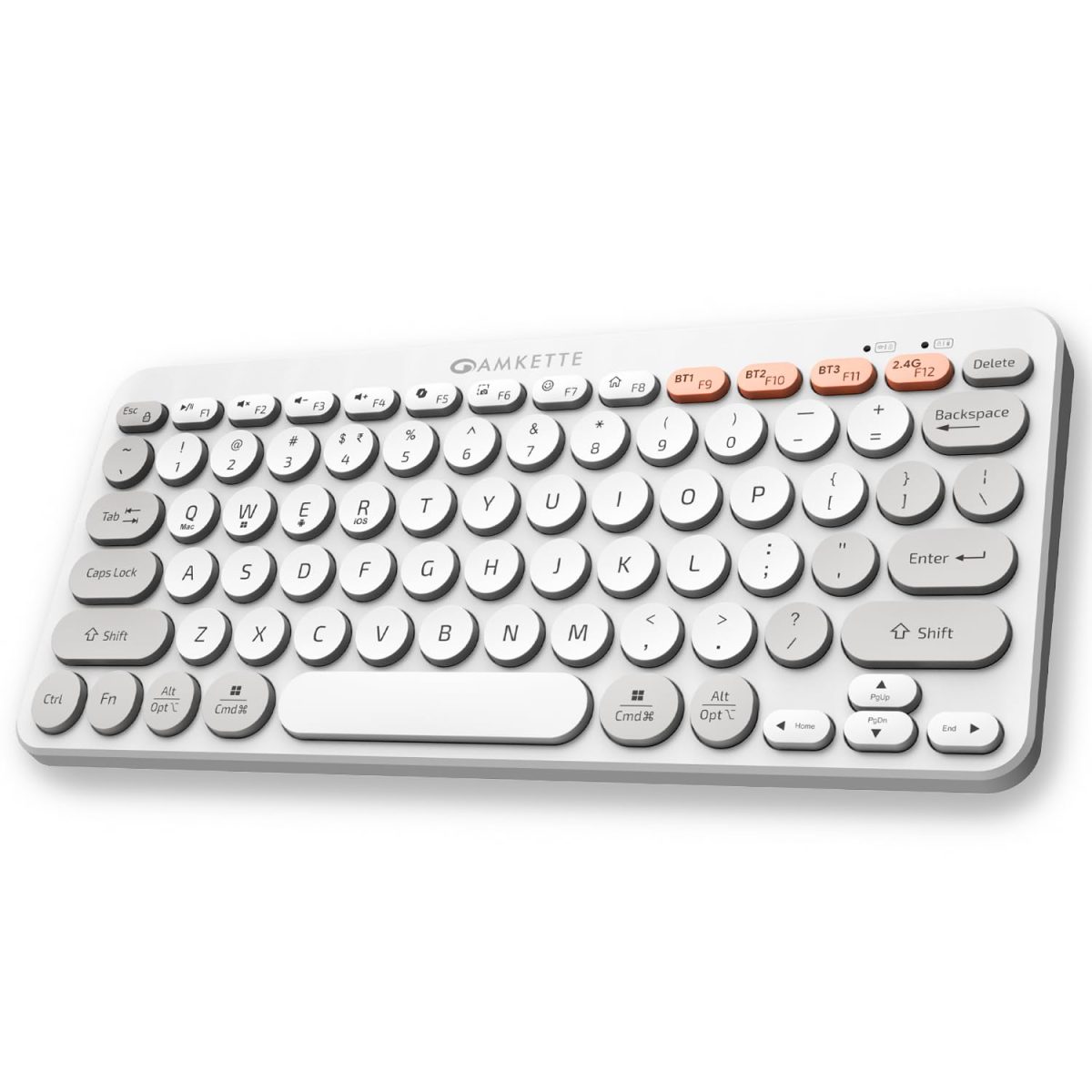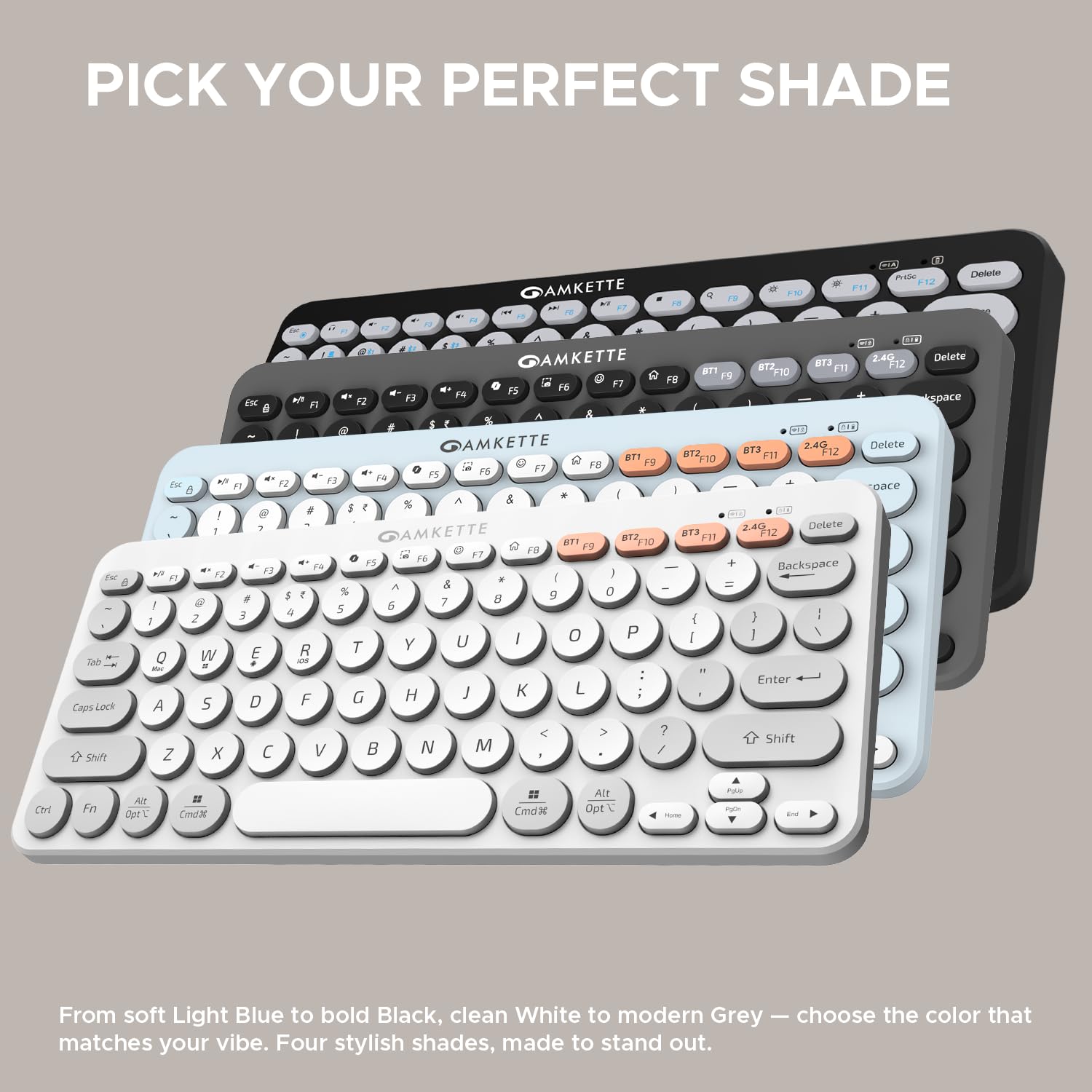 The Amkette Optimus Bluetooth 4-in-1 Keyboard combines retro pop style with modern multitasking. Connect up to 4 devices (3 Bluetooth + 1 Wireless), switch instantly, enjoy smooth silent typing, quick access keys like Copilot, and a compact, portable design built to impress.