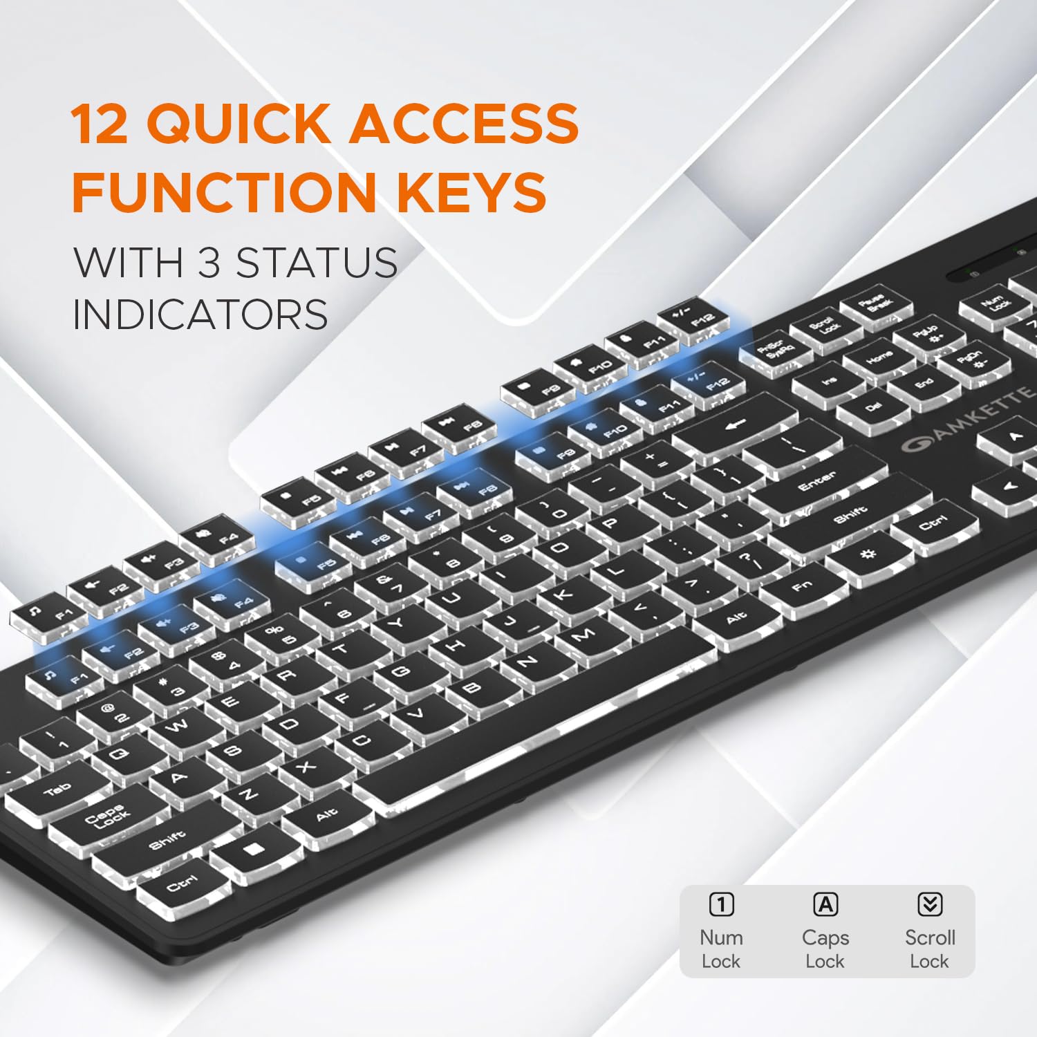 Amkette Wi-Key Backlit Wired Keyboard | White Backlit with Brightness Control | Laser-Etched Keys | 12 Multi-Media Keys | Plug and Play USB Connection | Compatible with PC/Mac/Laptop | 1 Year Warranty