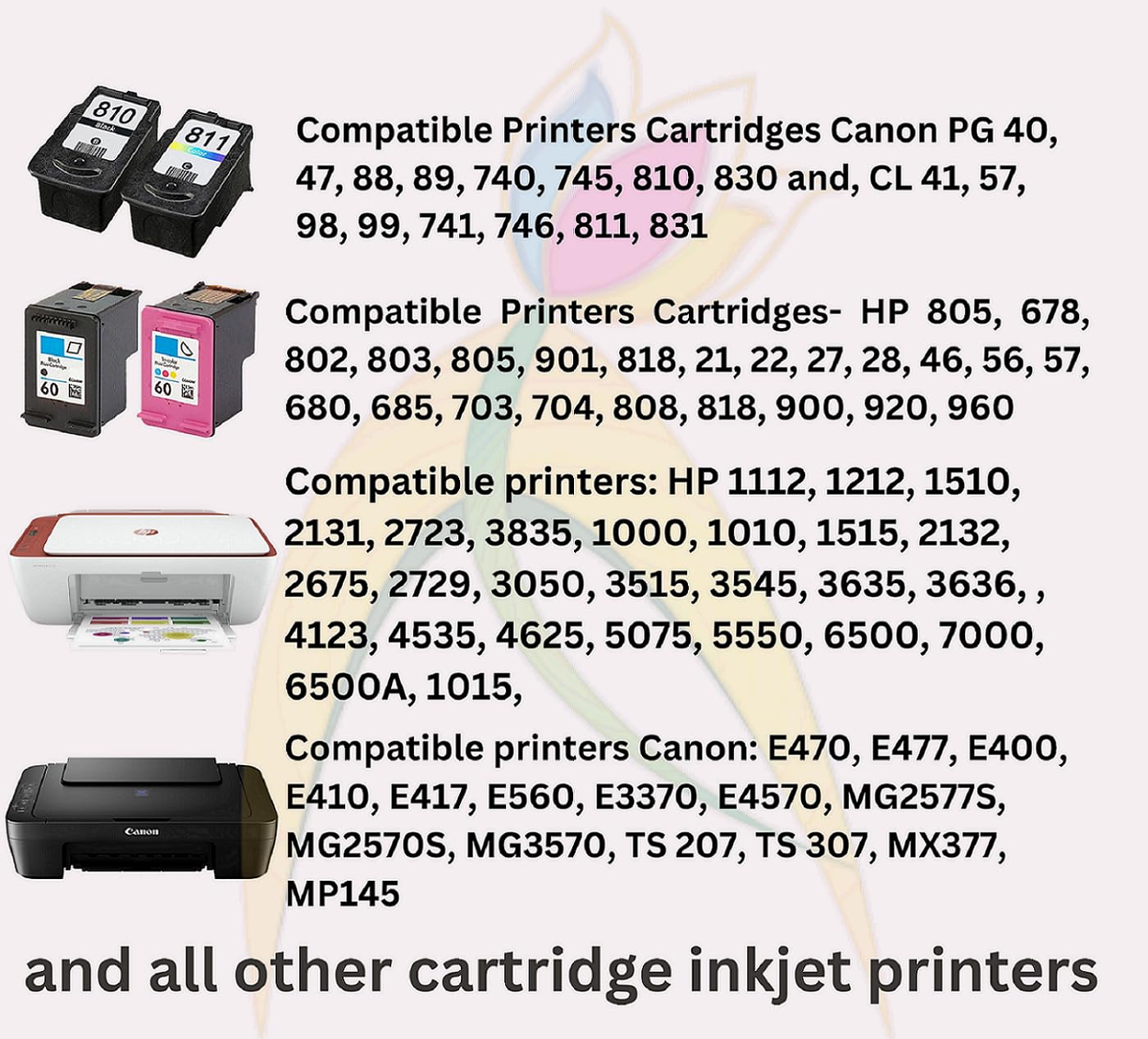 Compatible Printers Cartridges- 805, 860, 861, 803, 680, 678, 682, 818, 802, 901, 703, 704, 702, 831, 830, 46, 21, 22, 27, 28, 56, 57&, PG88, CL98, PG745, CL746, PG810, CL811, PG740, CL741, PG40, CL41, PG89, CL99, PG830, CL831 Compatible printers: 1112, 1212, 1510, 2131, 2723, 3835, 1000, 1010, 1515, 2132, 2675, 2729, 3050, 3515, 3545, 3635, 3636, 4123, 4535, 4625, 5075, 5550, 6500, 7000, 6500A, 1015, Can: E470, E477, E400, E410, E417, E560, E3370, E4570, MG2577S, MG2570S, MG3570, TS 207, TS 307, MX377, MP145 and all other cartridge inkjet printers Enjoy High Yield & Easy to refill — 4000 Pages/Black, 6500 Pages/Colours per Bottle at 5% coverage Pages. How To Refill: Suck required ink into syringe from the ink bottle. Around 3 -5 ML is required to fill in each colour holes and 3 ML – 15 ML in black cartridge. It Depends on your Cartridge mode, slowly push the piston of the syringe into the hole. It should be very slow and careful. Do not overfill the sponge. Watch carefully while injecting