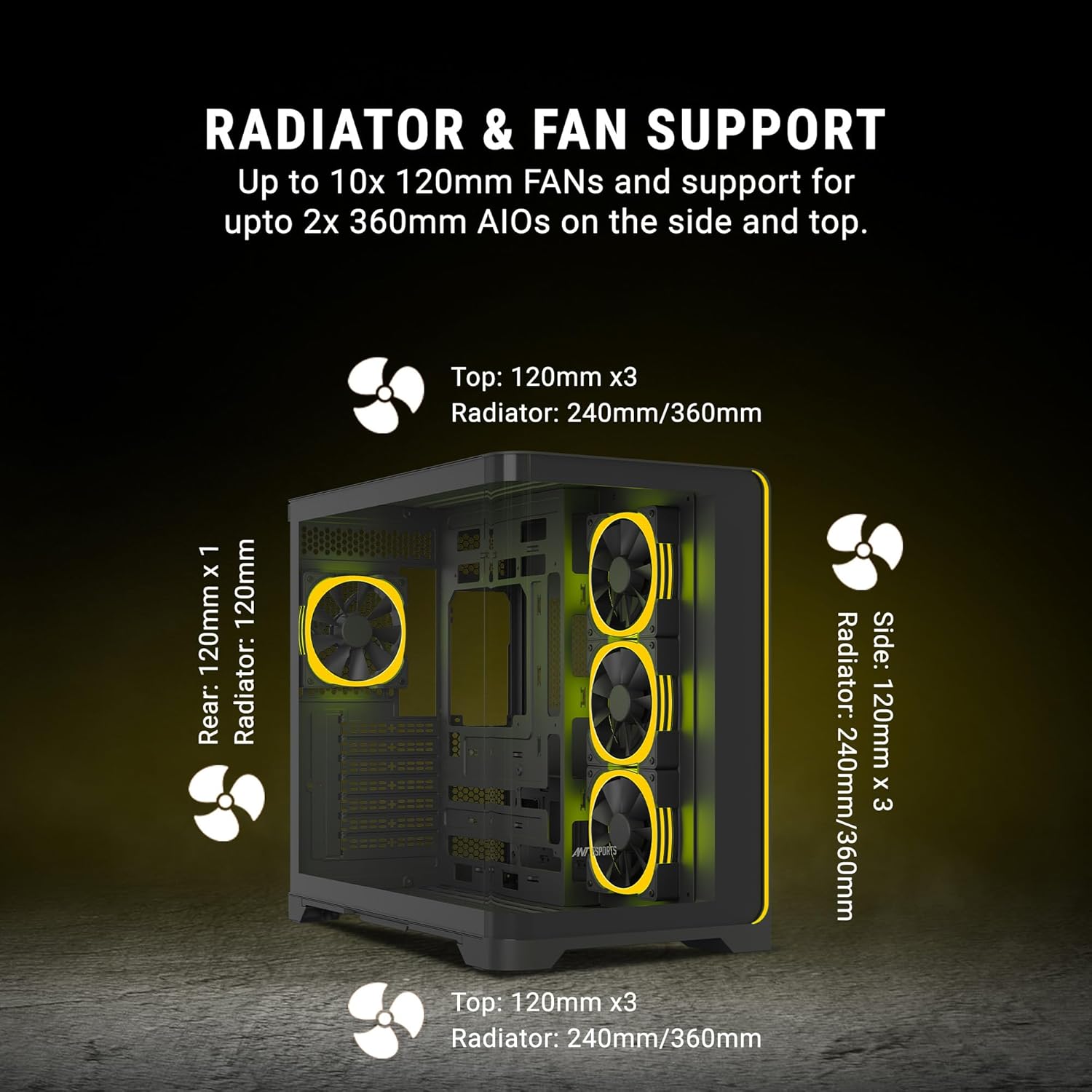 Great Cooling and Airflow Options With 4 Pre-Installed ARGB-PWM Fans and up to 360mm Radiator Mount on the Top and Side, get optimal bottom-top updraft of airflow.