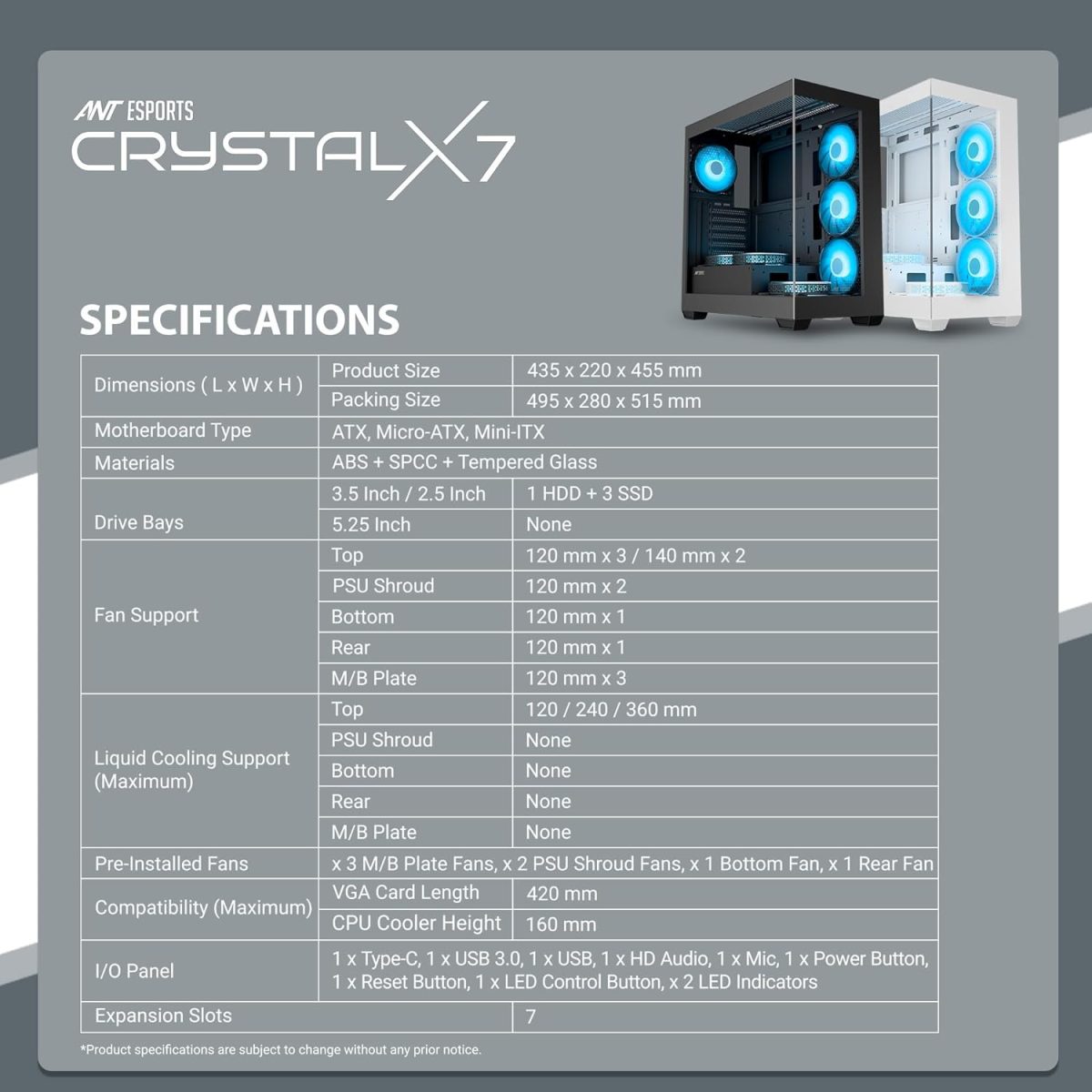 Be the first to review “Ant Esports Crystal X7 ATX Computer Case/Gaming Cabinet with Type-C – White | Support ATX, Micro-ATX, Mini-ITX | Pre-Installed 3 M/B Plate Fans, 2 PSU Shroud Fans, 1 Bottom & 1 Rear Fan”