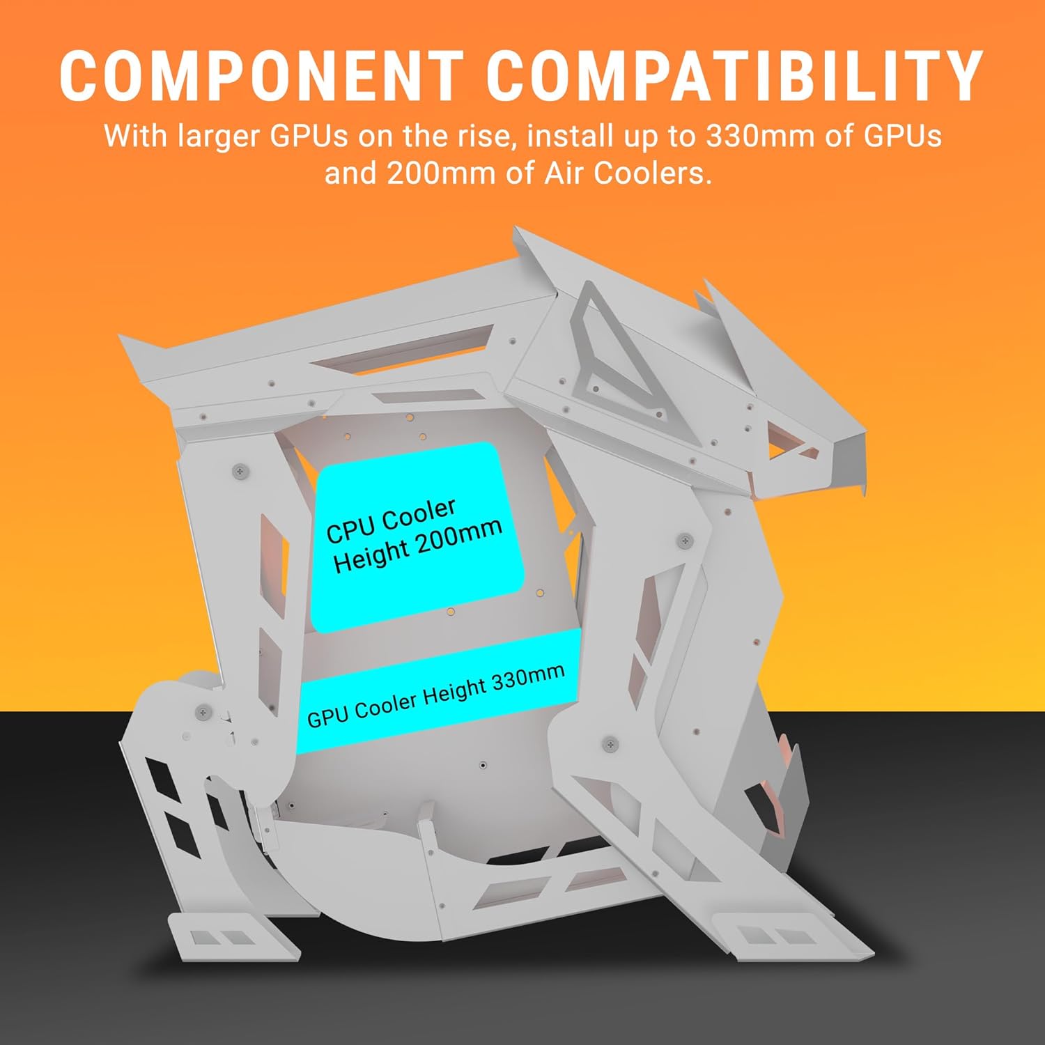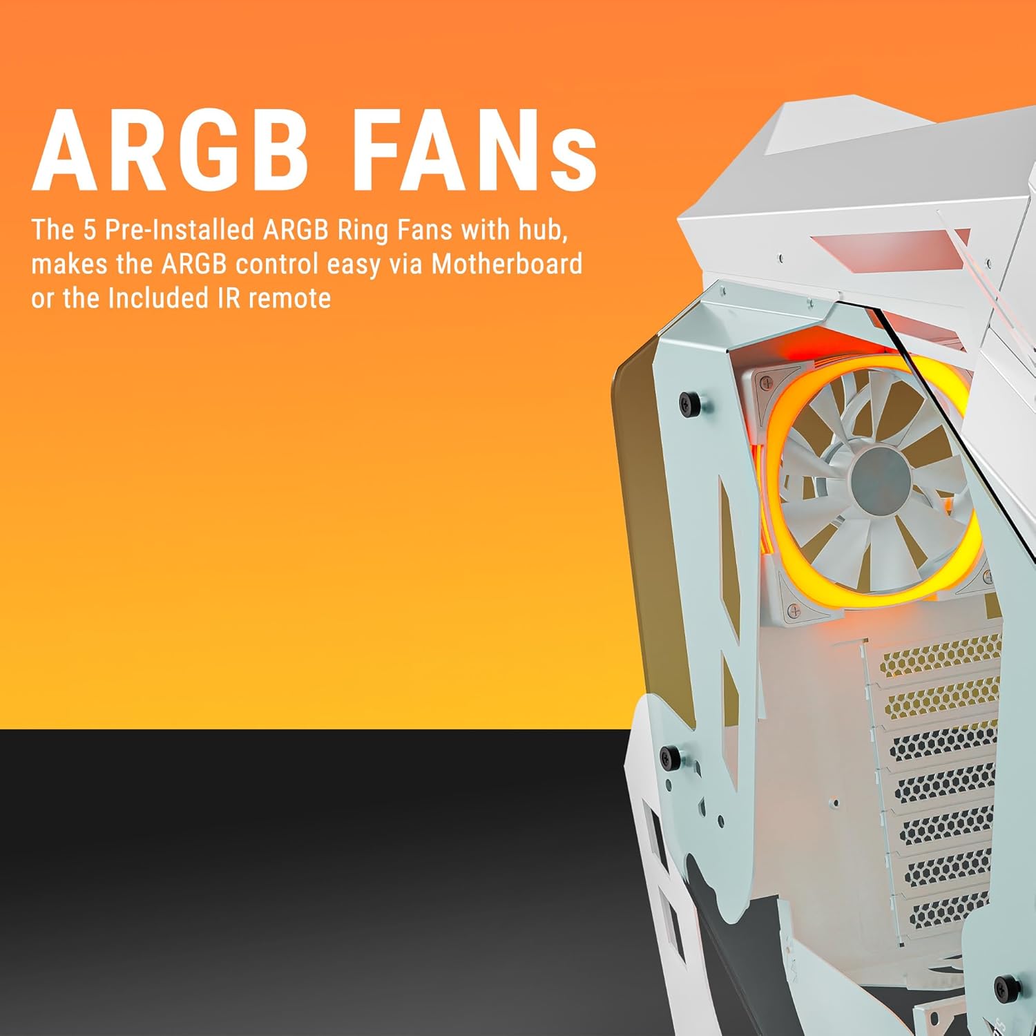 Extreme Cooling: Redefined Experience the extreme cooling performance of the chassis with all-around airflow with open spaces and included 5*120mm ARGB Ring FANs or up to 240mm Radiator on the Top