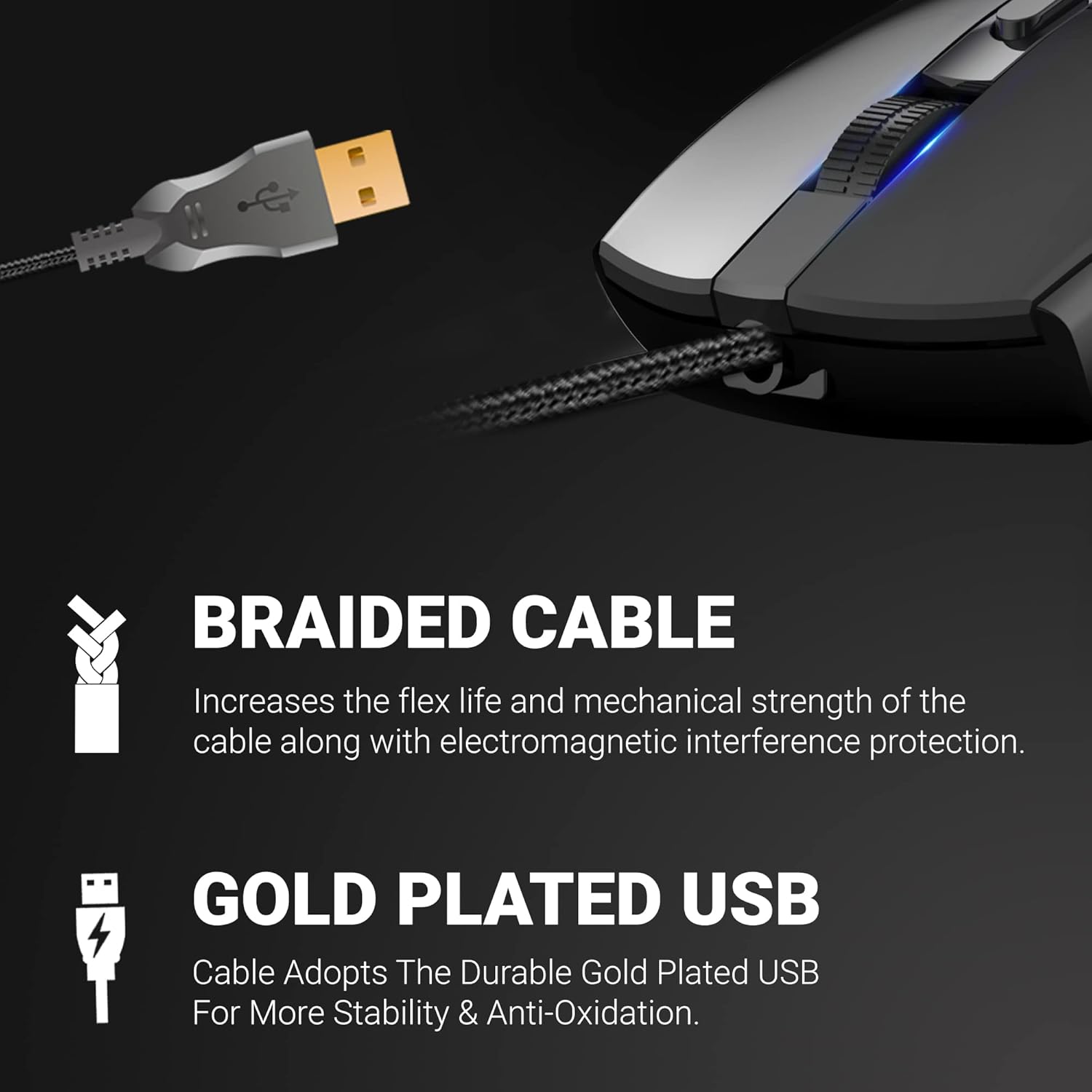 GM60 Comes with braided Cable, Cable Adopts the durable gold plated USB for more stability & Anti-Oxidation.