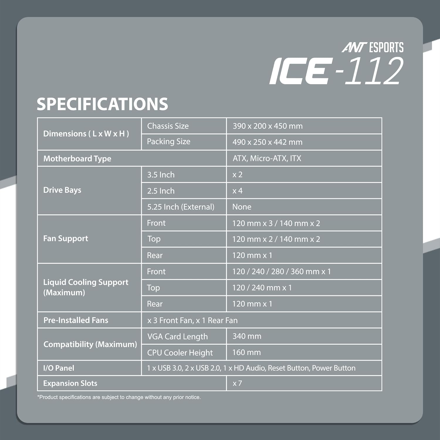 Be the first to review “Ant Esports ICE- 112 Mid- Tower Computer Case/Gaming Cabinet – Black | Support ATX, Micro-ATX, ITX | Pre-Installed 3 Front Fans & 1 Rear Fan”