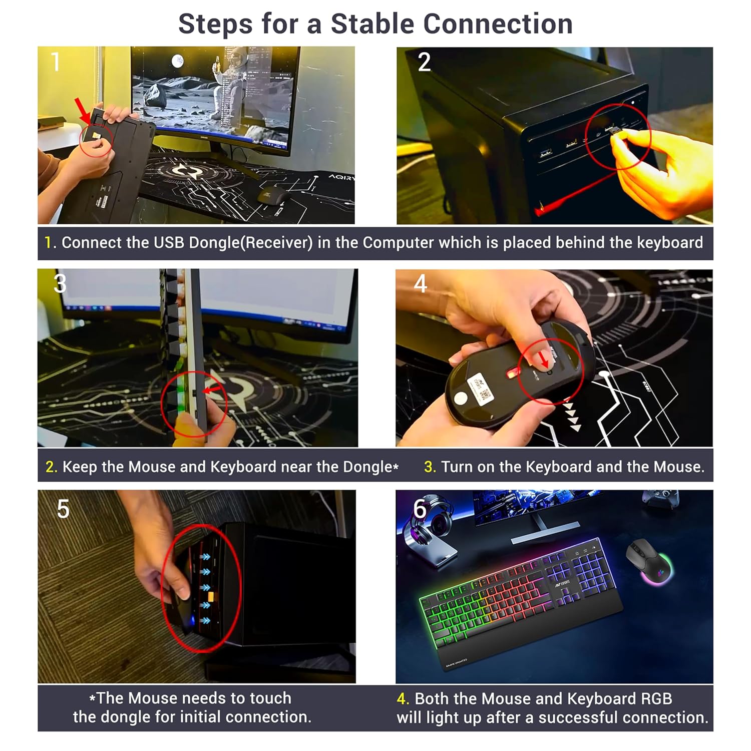 2.4Ghz Wireless Connection- Both the LED wireless gaming mouse and keyboard use a 2.4G wireless connection and share a USB adapter (the keyboard and mouse can also be used separately). The effective distance is 10 meters, with no delay and a response speed comparable to that of a wired keyboard. Attention: The USB adapter is on the back of the mouse or keyboard