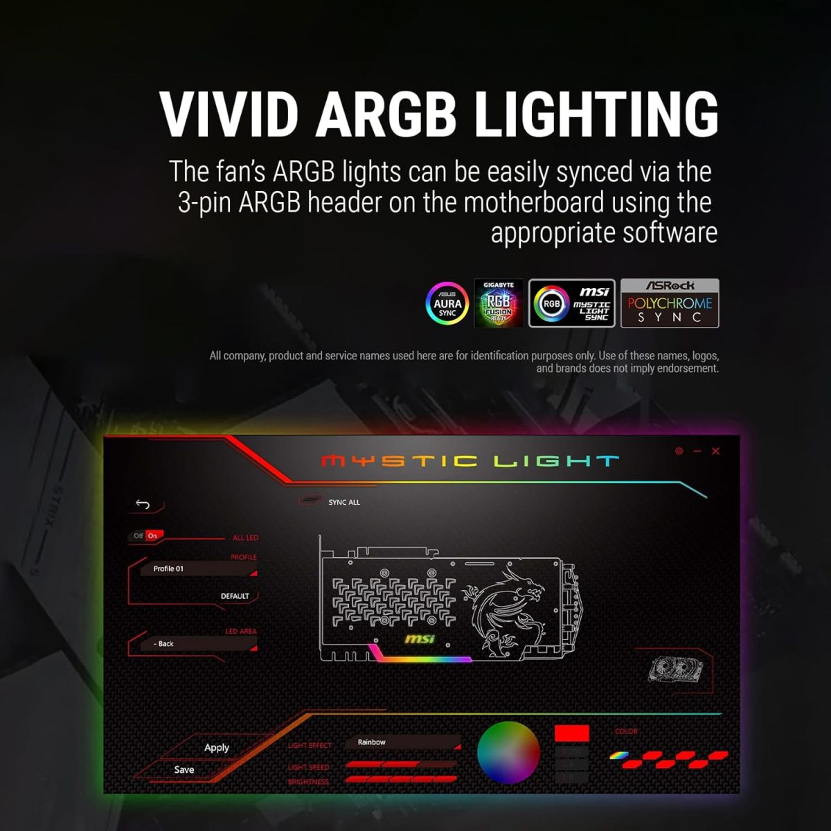 Universal Compatibility and Easy Control: With a 4-pin PWM connector for fan speed control through your motherboard’s BIOS settings and a 3-pin ARGB 5V connector, the Spectraflow offers universal compatibility. Take command of the ARGB colors and effects effortlessly using popular motherboard ARGB utilities such as Asus Aura, Gigabyte Fusion, MSI Mystic Light, and more, customizing your setup to match your unique style.