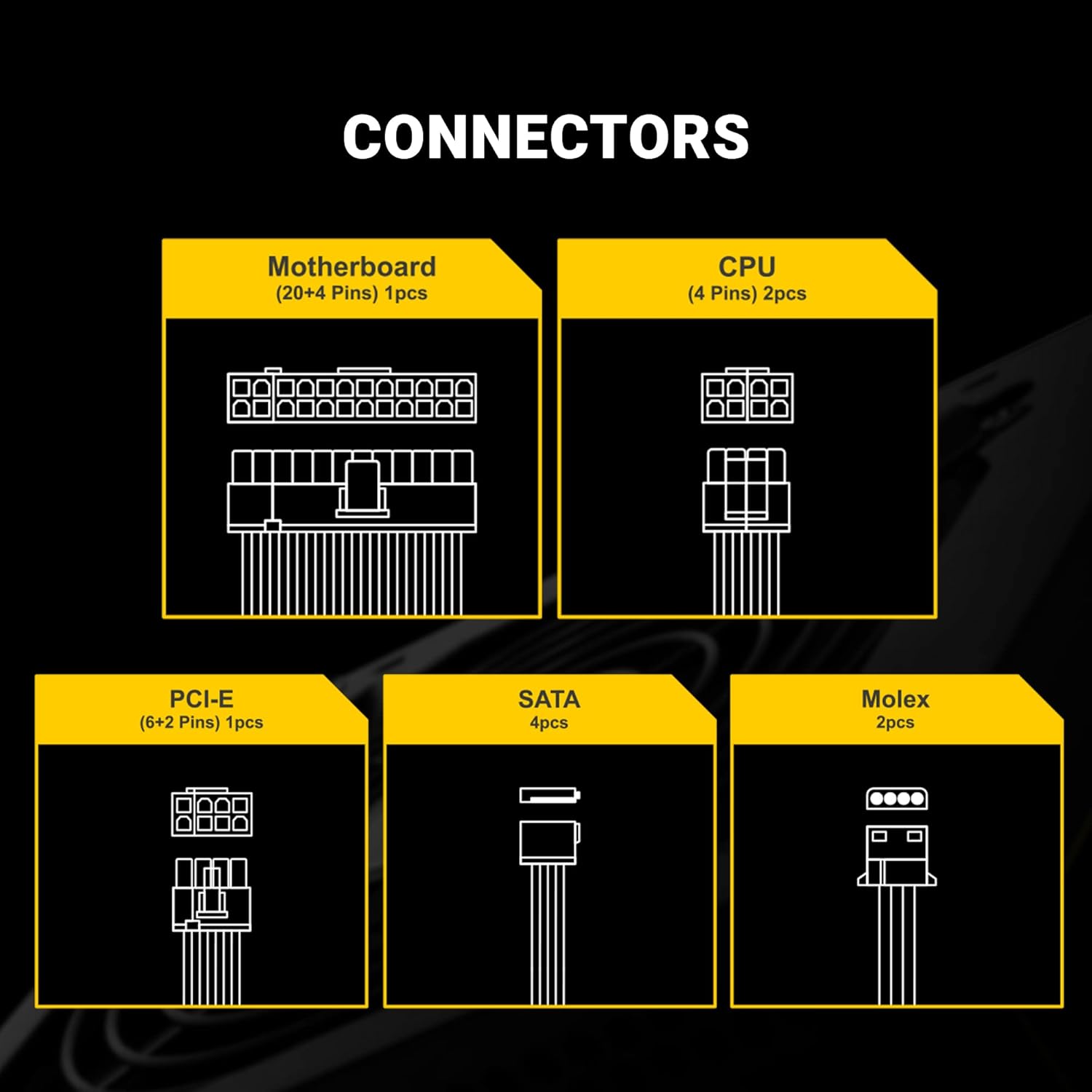 Motherboard – (20+4 Pins) x 1pcs CPU – (4+4 Pins) x 1pcs PCI-E – (6+2 Pins) x 1pcs SATA x 3pcs Molex x 2pcs Motherboard – (20+4 Pins) x 1pcs CPU – (4+4 Pins) x 1pcs SATA x 3pcs Molex x 2pcs Motherboard – (20+4 Pins) x 1pcs CPU – (4+4 Pins) x 1pcs PCI-E – (6+2 Pins) x 1pcs SATA x 4pcs Molex x 2pcs Motherboard – (20+4 Pins) x 1pcs CPU – (4+4 Pins) x 1pcs PCI-E – (6+2 Pins) x 1pcs SATA x 3pcs Molex x 2pcs Motherboard – (20+4 Pins) x 1pcs CPU – (4+4 Pins) x 1pcs PCI-E – (6+2 Pins) x 1pcs SATA x 3pcs Molex x 2pcs