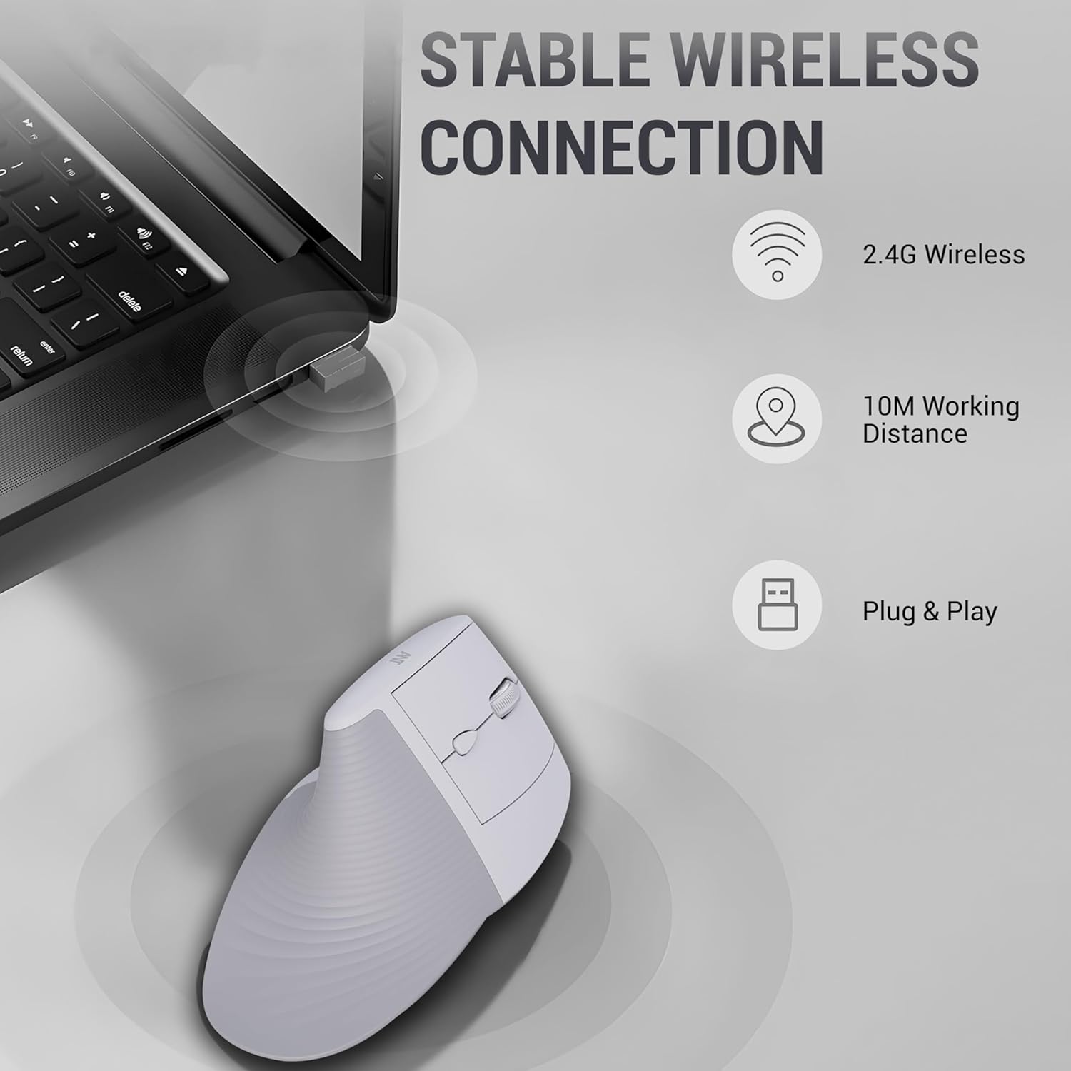 Stable Wireless Connection: The ergonomic rechargeable mouse adopts advanced 2.4 GHz wireless technology, ensuring stable and quick performance. This cordless vertical ergonomic wireless mouse supports plug-and-play, so connect the included USB receiver to the USB port of your computer, no additional driver is needed