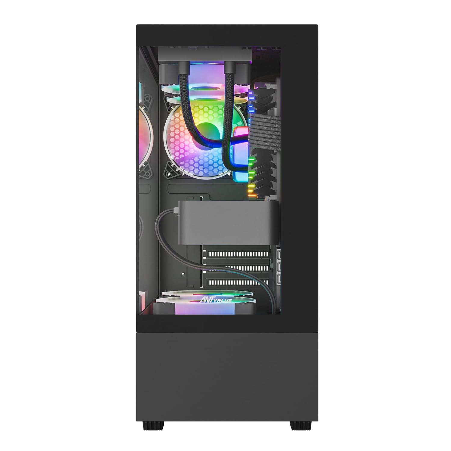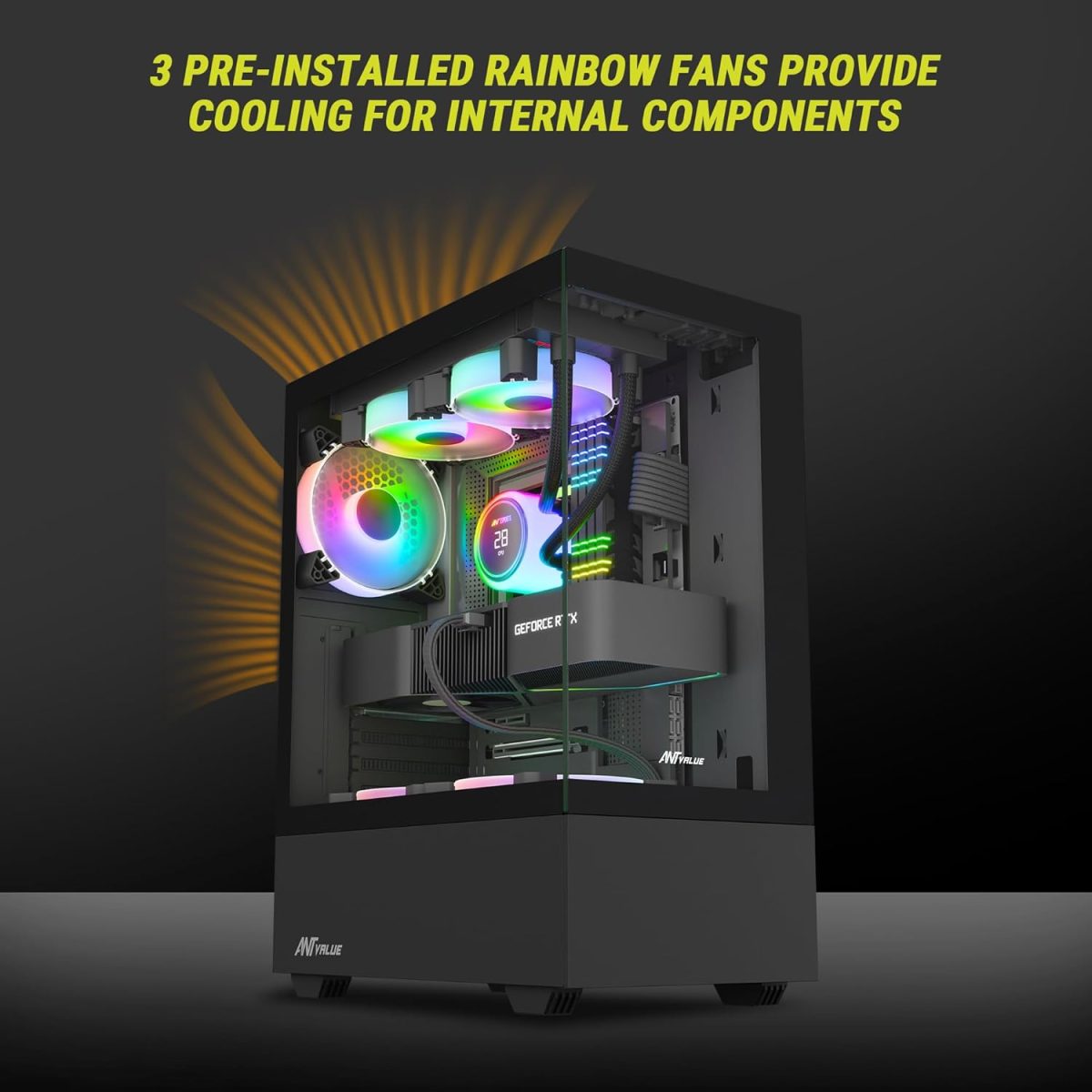 Ant Value Tempered_Glass CV100 Mid-Tower Computer Case/Gaming Cabinet – Black | Support ATX, M-ATX, ITX | Pre-Installed 2 Top & 1 Rear Rainbow Fans