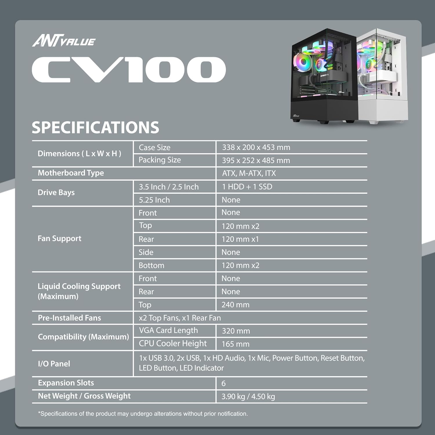 Be the first to review “Ant Value Tempered_Glass CV100 Mid-Tower Computer Case/Gaming Cabinet – White | Support ATX, M-ATX, ITX | Pre-Installed 2 Top & 1 Rear Rainbow Fans”