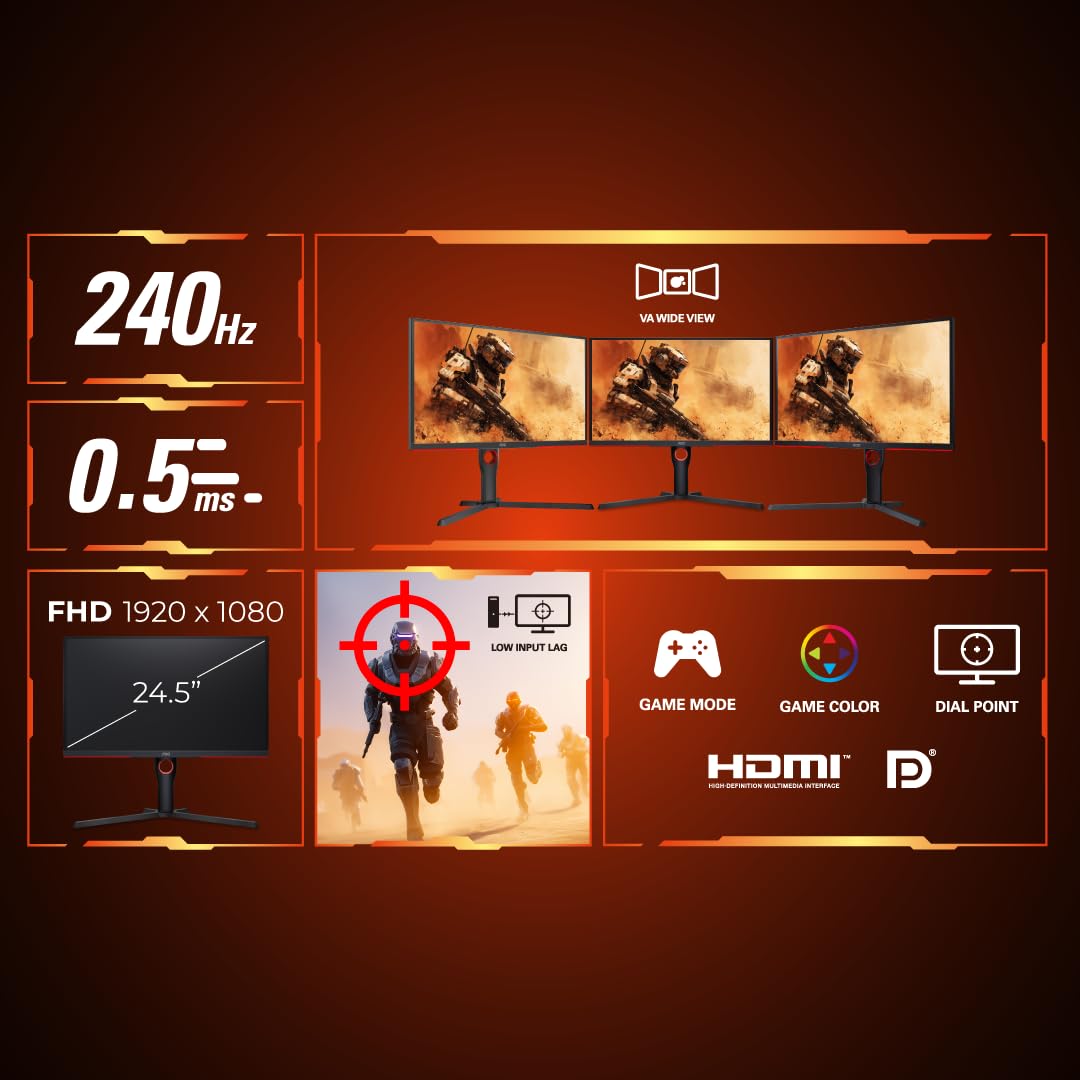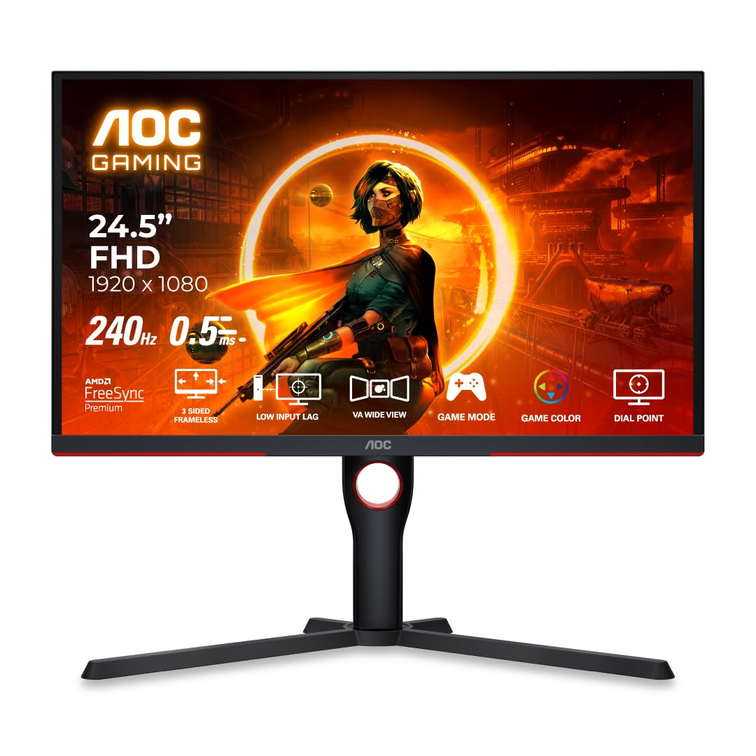 AOC 25G3ZM/BK 24.5″ FHD Gaming Monitor, 240Hz Refresh Rate, 1ms GTG Response Time, VA Panel with 3000:1 Contrast Ratio, Adaptive Sync, Low Input Lag, ShadowControl, HDMI & DisplayPort